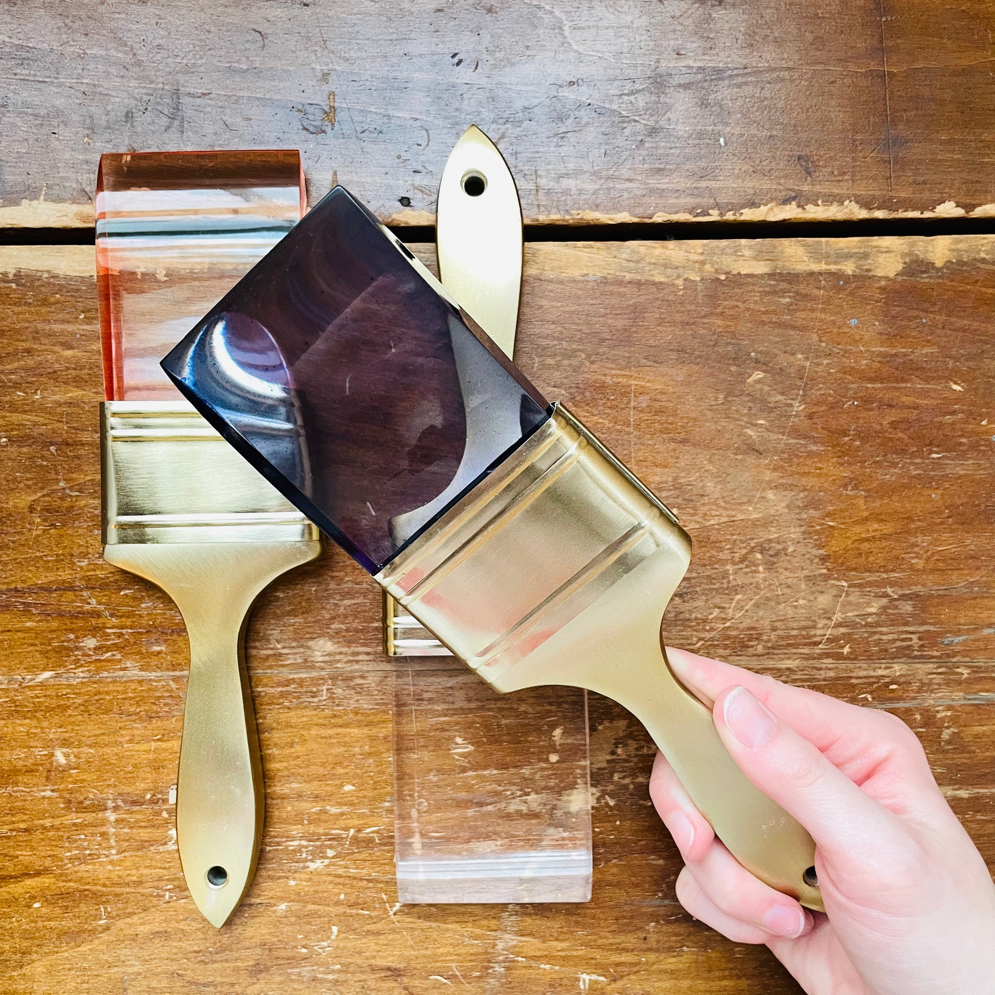 Display your creative spirit with this acrylic paint brush—a conversation starter that works as wall art or tabletop décor. Available in three color ways—clear, indigo, and pink—with gold accents, each brush measures 9.5" long and features functional handles with holes for hanging. Place it on a stack of books, rest it on a tray, or mount it on your wall. Perfect for artists, collectors, and anyone who celebrates color and imagination in their home.