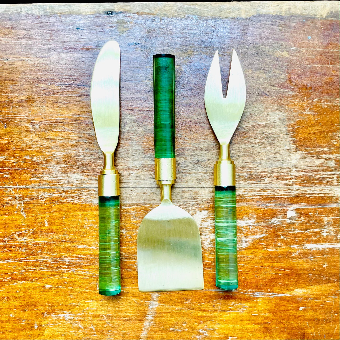 Add some color to your cheese board with this essential set - the Aqua Acrylic Cheese Knife Set. The bright green handles and gold hardware make a stylish statement while serving up your charcuterie board to friends. Upgrade your hosting game with this playful set.