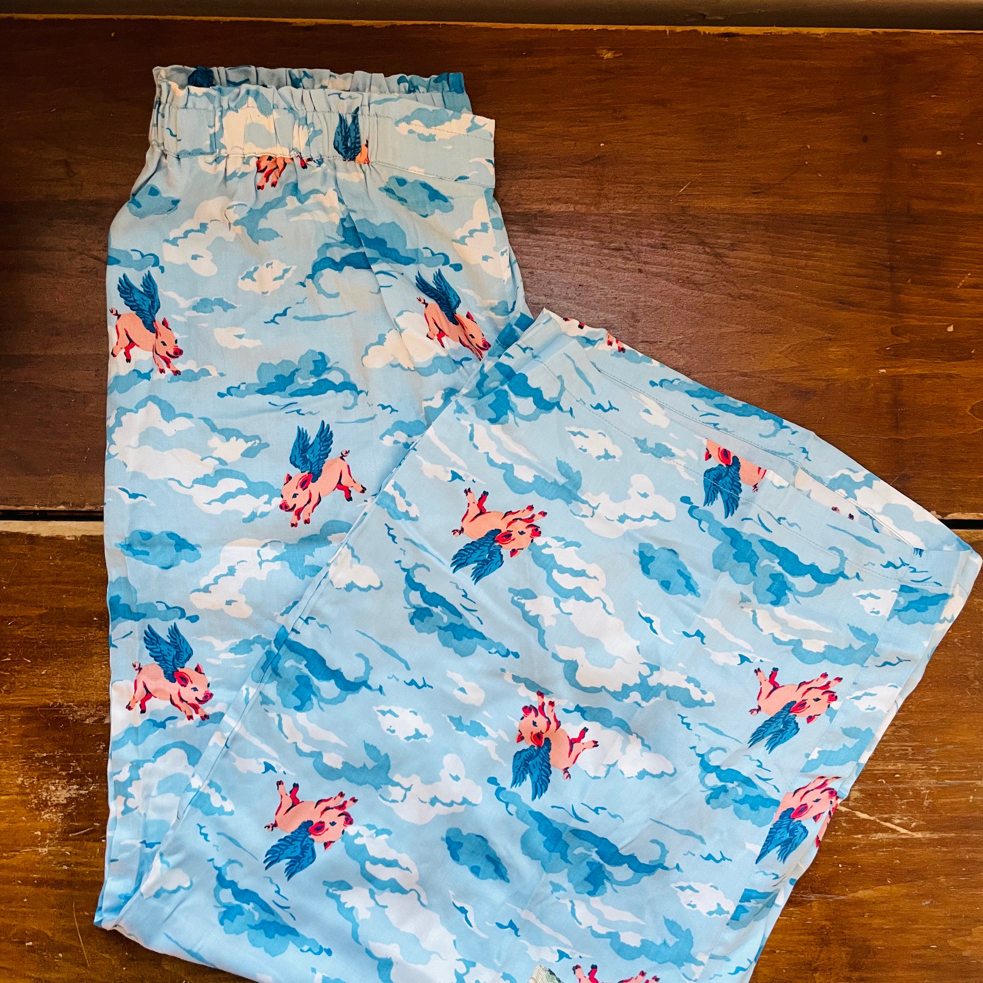 Dream big in this satin pajama set in soft pale blue, featuring winged pigs soaring through clouds on silky Eco Satin. This woman’s wide-leg pajama set features a slightly cropped top with relaxed dropped shoulders and roomy high-rise pants with deep pockets. These whimsical pajamas are perfect for Valentine's gifting.