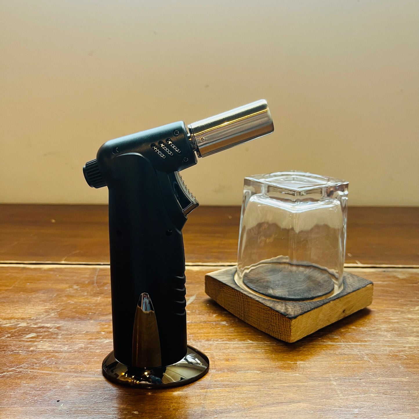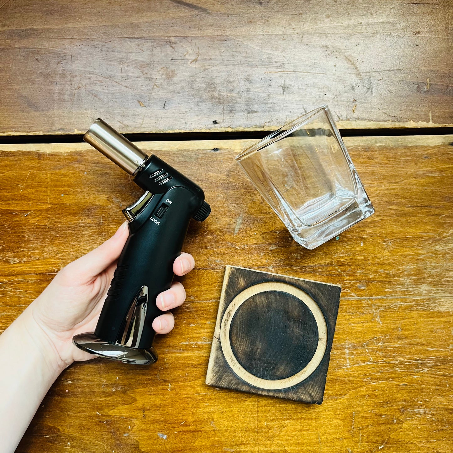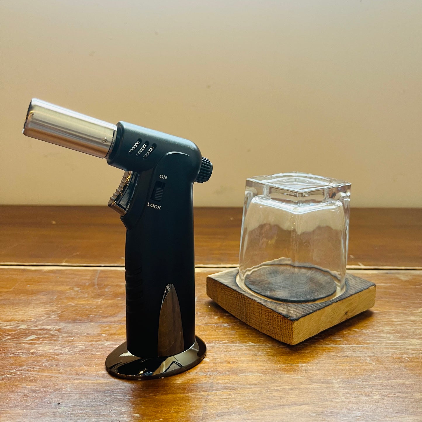 - Includes: 13 oz. lowball glass, authentic American oak whiskey barrel plank, and a handheld butane torch (fuel NOT included)