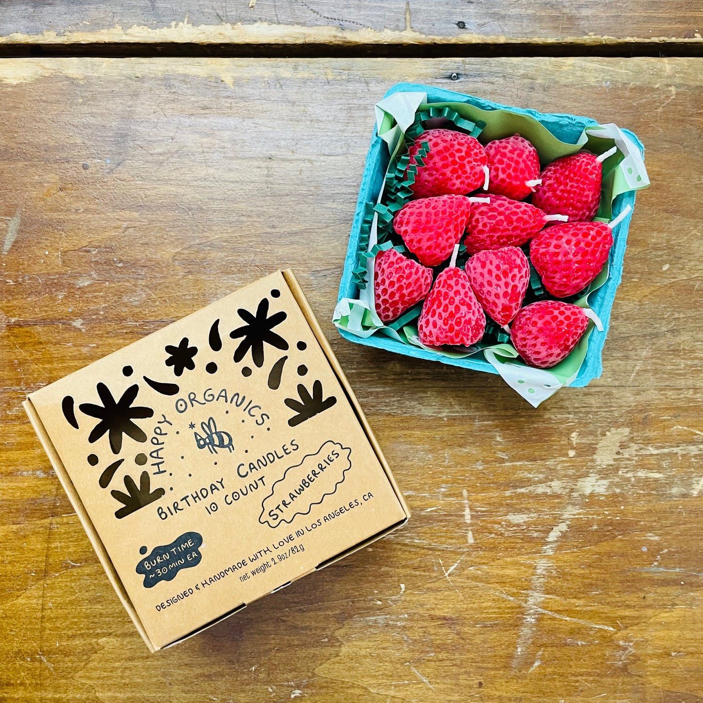 Comes with 10 strawberry birthday candles! The packaging for the 10-count includes the berry basket with green crinkle cut inside the brown kraft box.