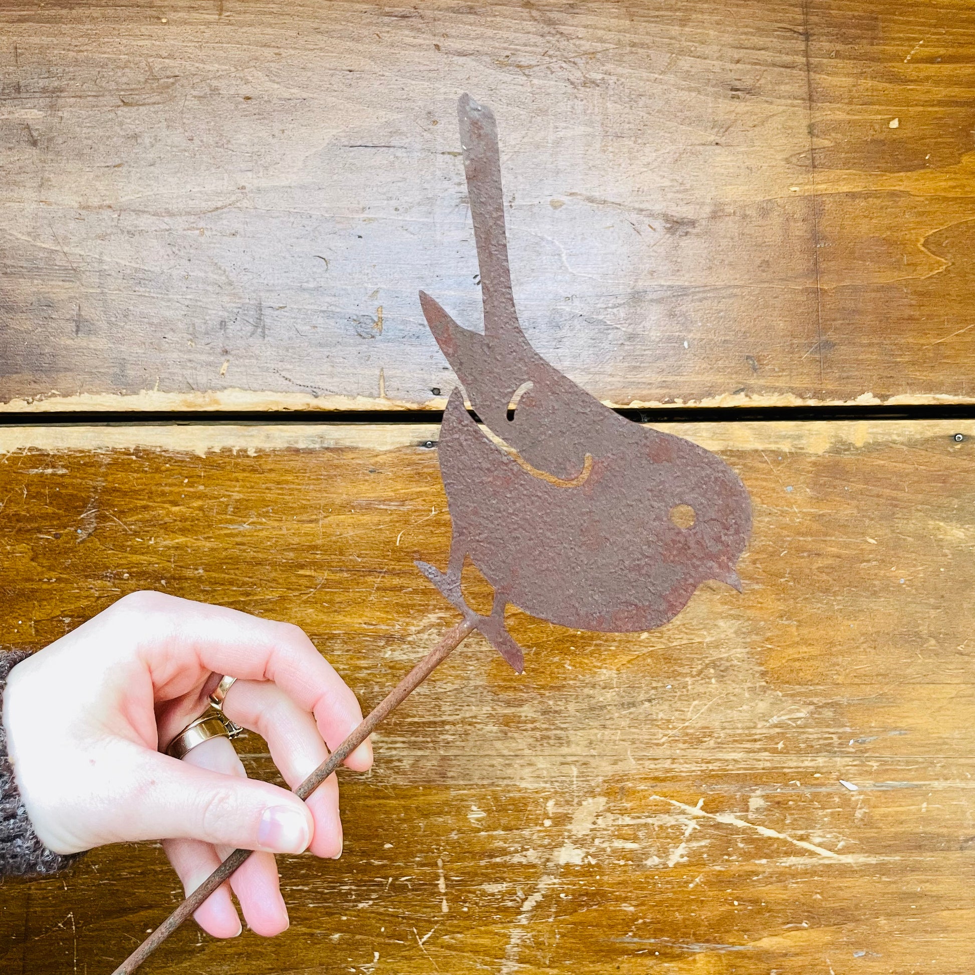 An adorable hand-crafted rust iron bird garden stake, perfect for adding a charming touch to your garden.