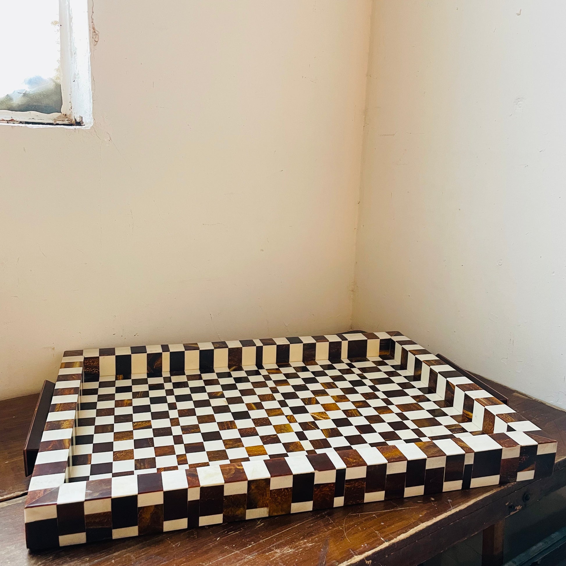 The Camiro Large Tray is a bold and contemporary decorative tray designed to make an impression. Its checkered surface pattern in warm brown and cream tones creates an eye-catching visual effect that works equally well in modern, eclectic, or global-inspired spaces. Measuring 27 inches long, 18 inches wide, and 2 inches high, this generously sized tray is perfect for serving drinks, organizing accessories, or anchoring tabletop vignettes with style. The rectangular shape is bordered by raised edges for secure placement, while the built-in side handles offer easy carrying without disrupting the geometric design. Crafted in durable resin, the tray maintains a polished look that holds up to regular use. Whether styled on a coffee table, bar cart, or console, the Camiro tray adds instant sophistication and pattern to your space.