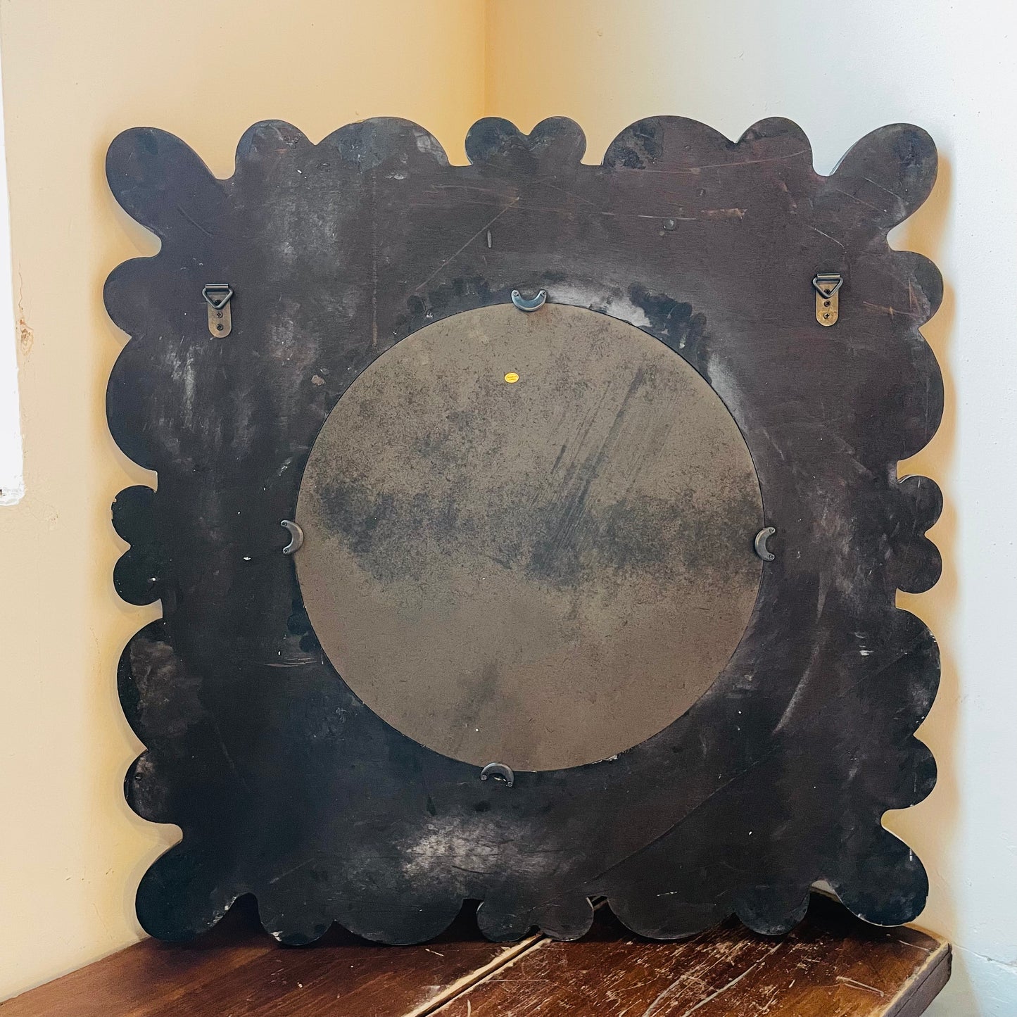 This fleur de lis framed mirror features a circular mirror with a square frame. In each corner sprouts a fleur de lis. Use this charming mirror to add some southern flair to antique styles.