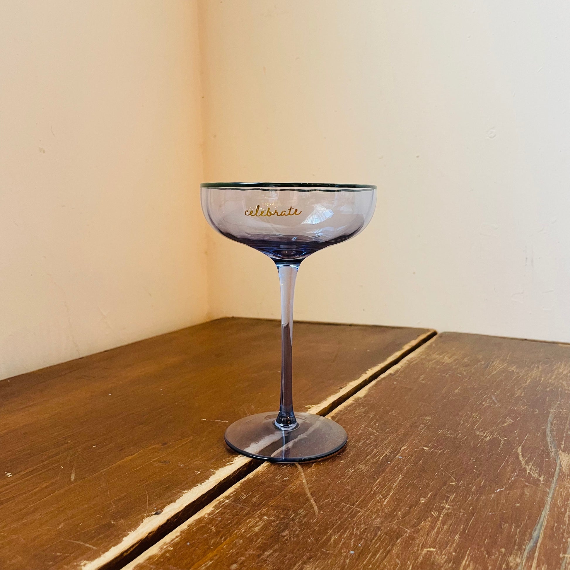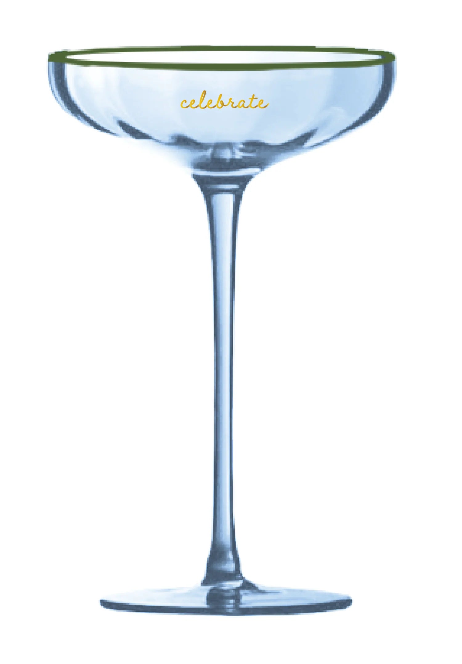 6 oz colorful lead-free crystal coupe glass. Gold inscription reads "Celebrate!" Elevate your party with this elegant coupe, featuring a cool blue bowl and base with a green-accented rim. Whether it’s a baby shower, anniversary, or holiday gathering, this glass brings a touch of sophistication and fun to your table. Hand wash only.