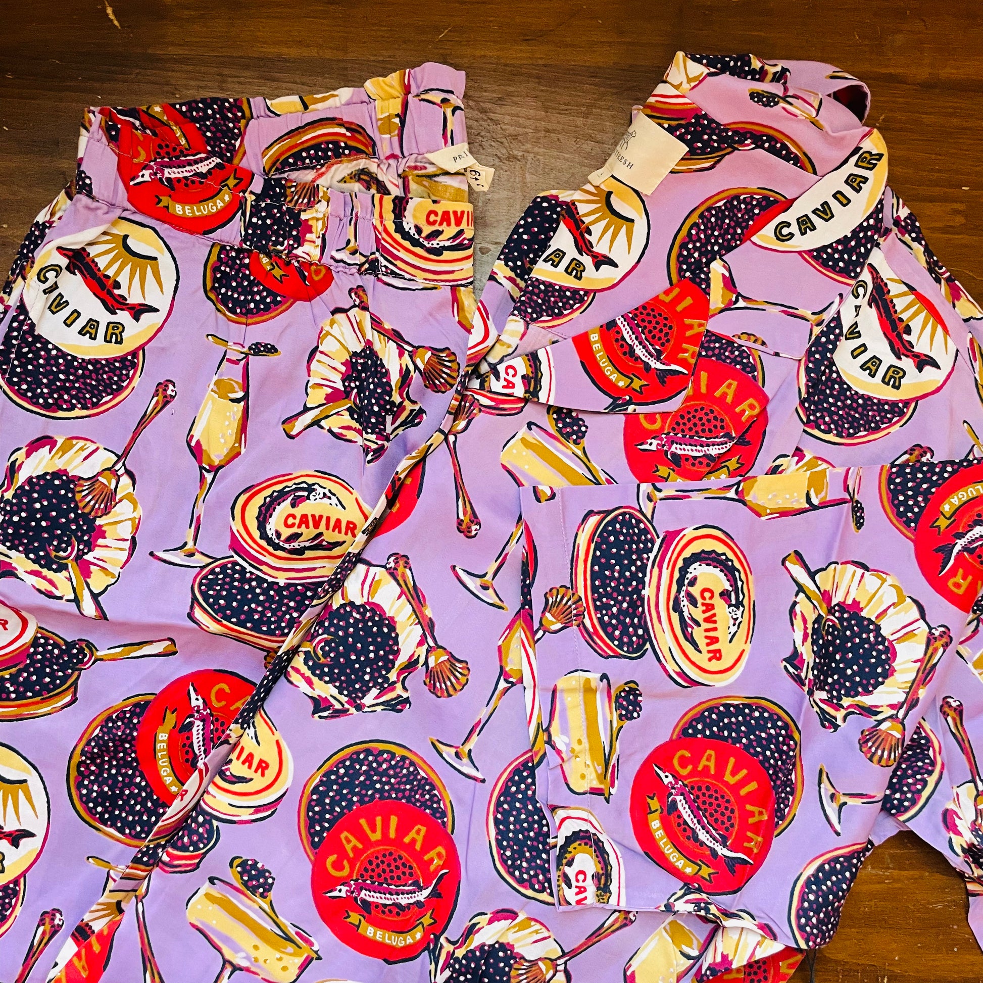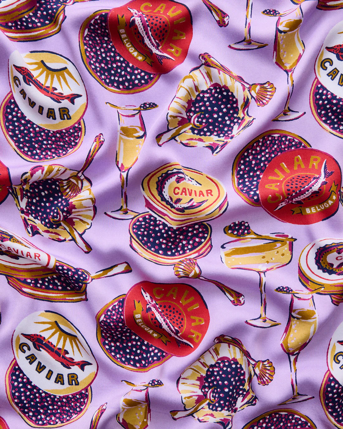 Toast to luxury in our Champagne & Caviar satin lounge set. This champagne print sleepwear features vintage caviar tins and bubbly flutes on silky Eco Satin. Our Wildest Dreams set creates a breezy silhouette, with a slightly cropped top and wide-leg pants with pockets. Perfect for celebratory weekends or cocktail-hour lounging.