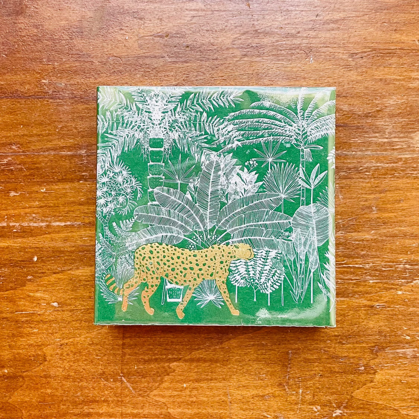 Cheetah in the jungle is a gorgeous design by our good friend and talented artist Ariane Butto. The cheetah slinks through a dreamy scene of palms, banana trees, bromeliads and carnaubas that look almost out of this world to bring some gorgeous green and gold-detailed rainforest dreams straight into your home space.