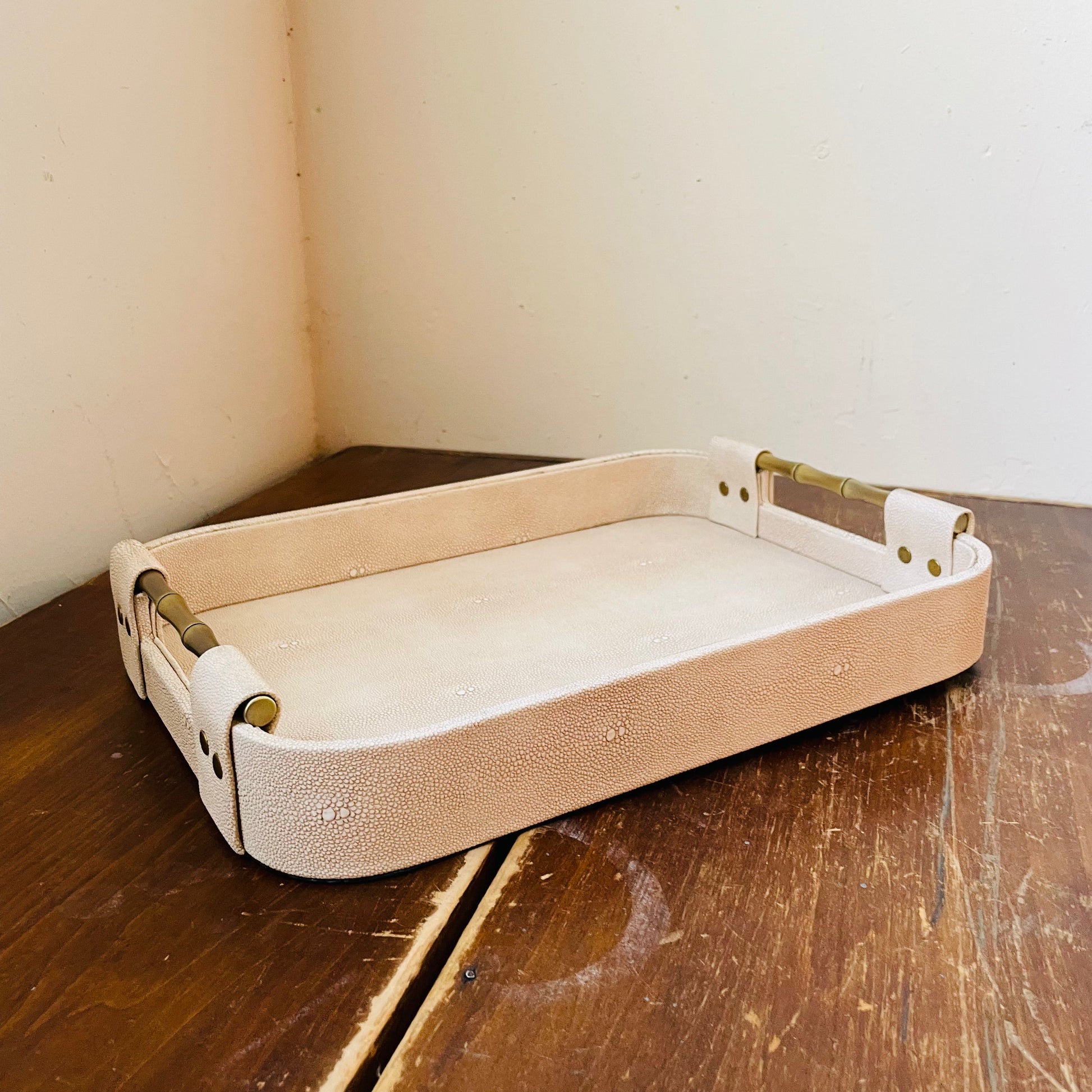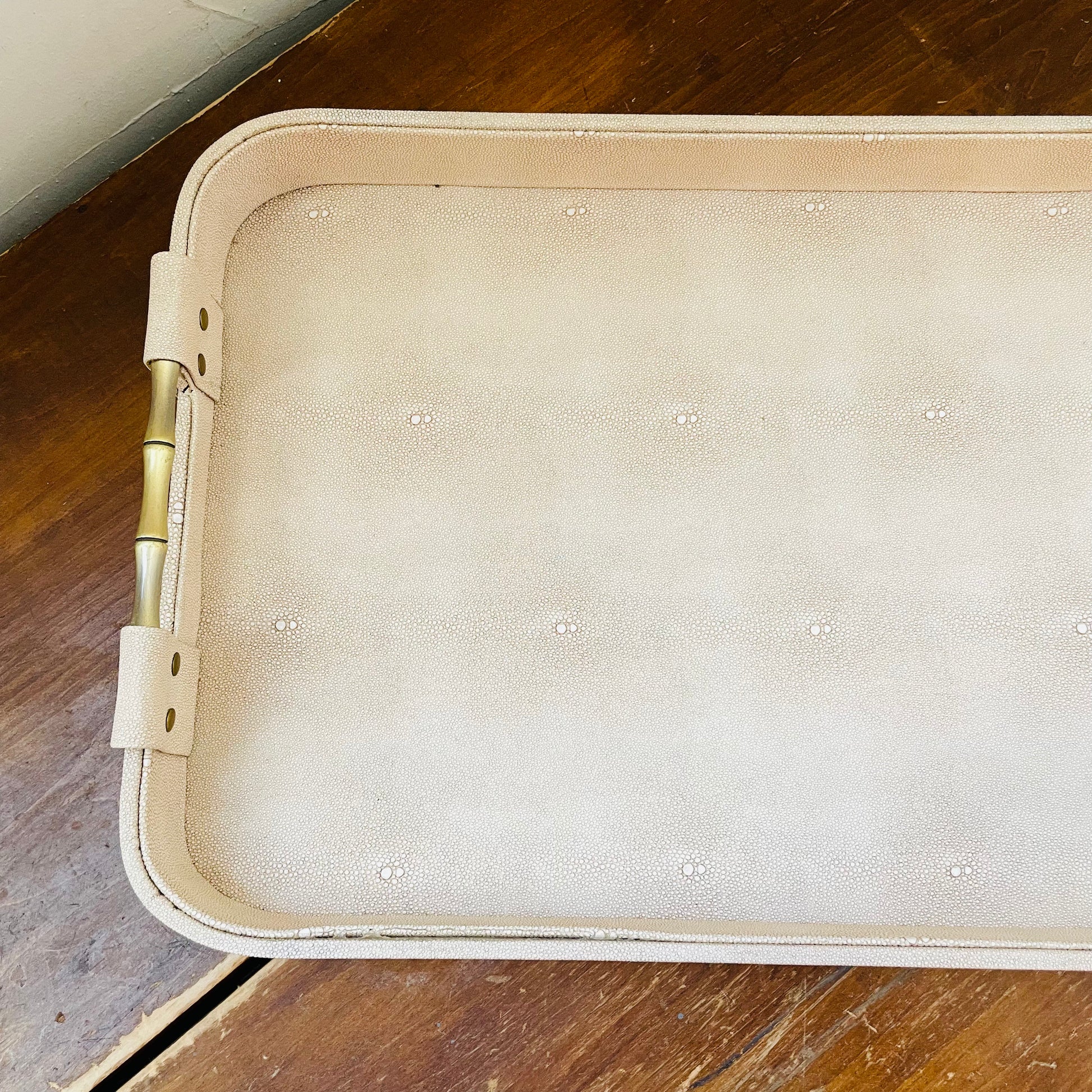 Elevate your space with our Cream Shagreen Decorative Trays. Crafted with precision, these trays feature a luxurious cream shagreen design and elegant faux bamboo metal handles for a touch of sophistication. Whether displayed on a coffee table or used for serving guests, these trays are as practical as they are stylish.
