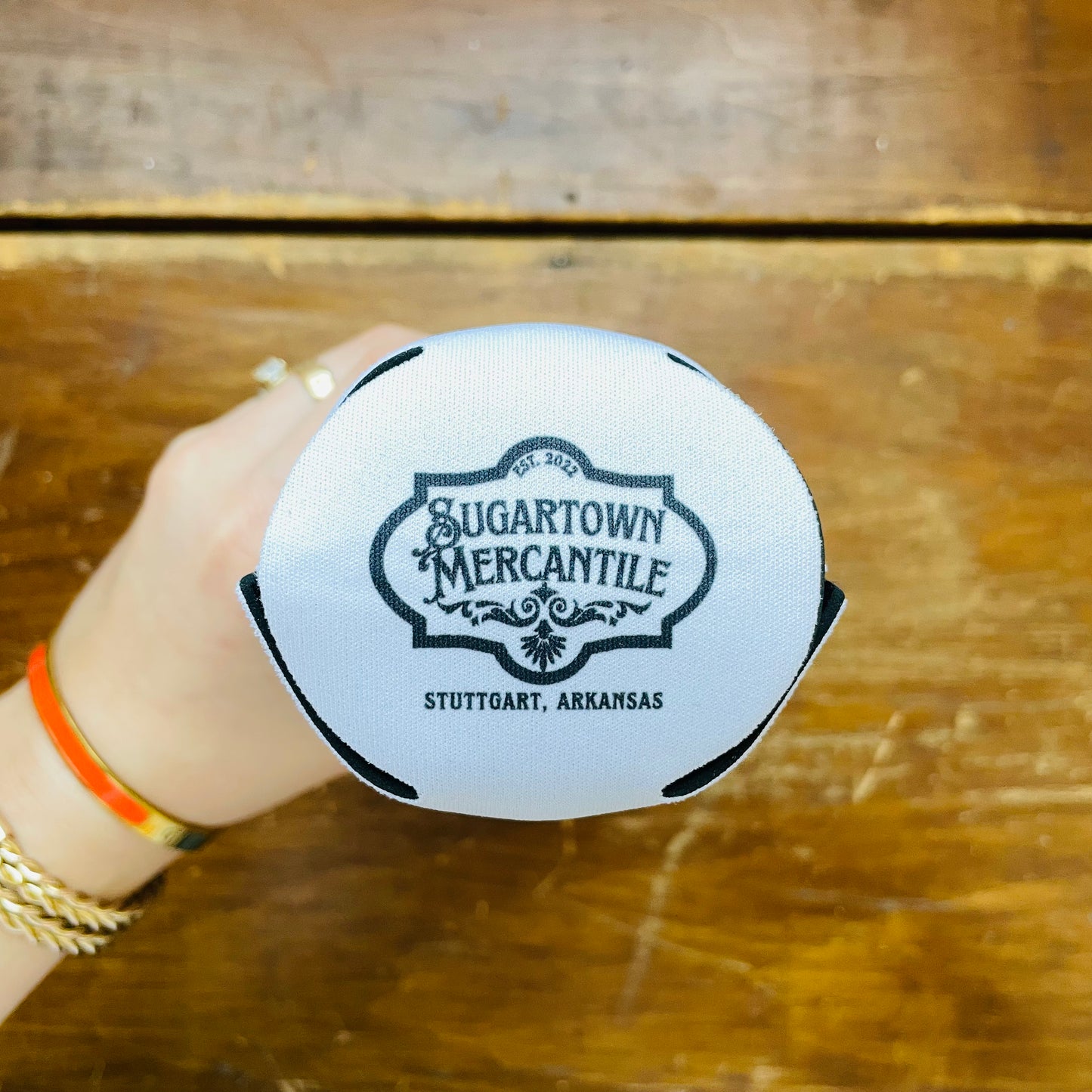 Fits standard size cans. Has our logo on the bottom.