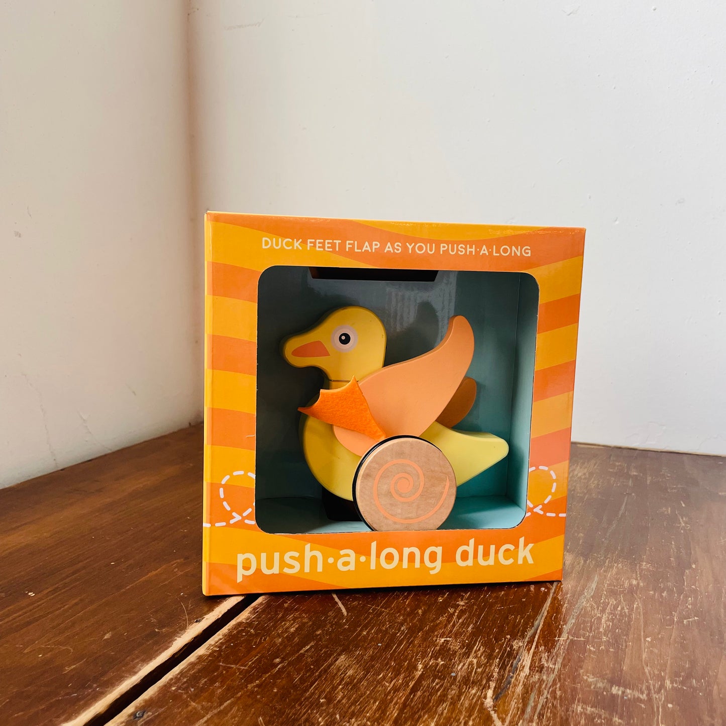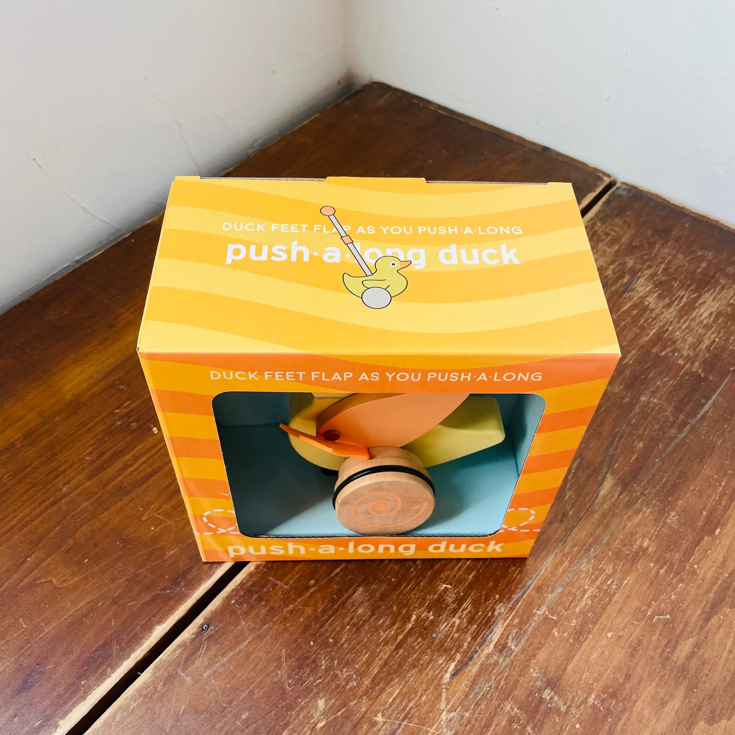 Push toys are a favorite of toddlers and parents everywhere. Enjoy our take on this wooden classic with this duck push toy. The Duck wobbles as pushed and and flaps his feet and wings. Two-piece stick breaks down to fit in a beautiful gift box, or for easy storage and travel.