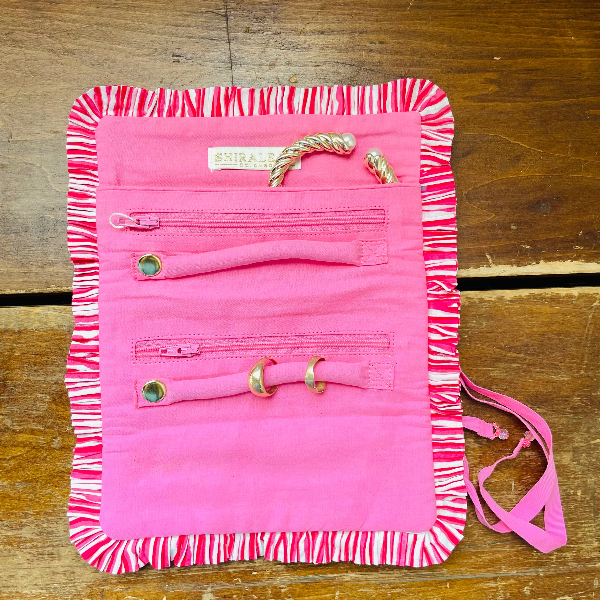 Easily travel with all your jewelry with the Elle Jewelry Roll. Rolls & ties into a 8"x3.5" pack that has two ring holders, two zip pouches & one pocket. Embellished with striped ruffled & beaded flair at then end of each ribbon tie. A practical gift!