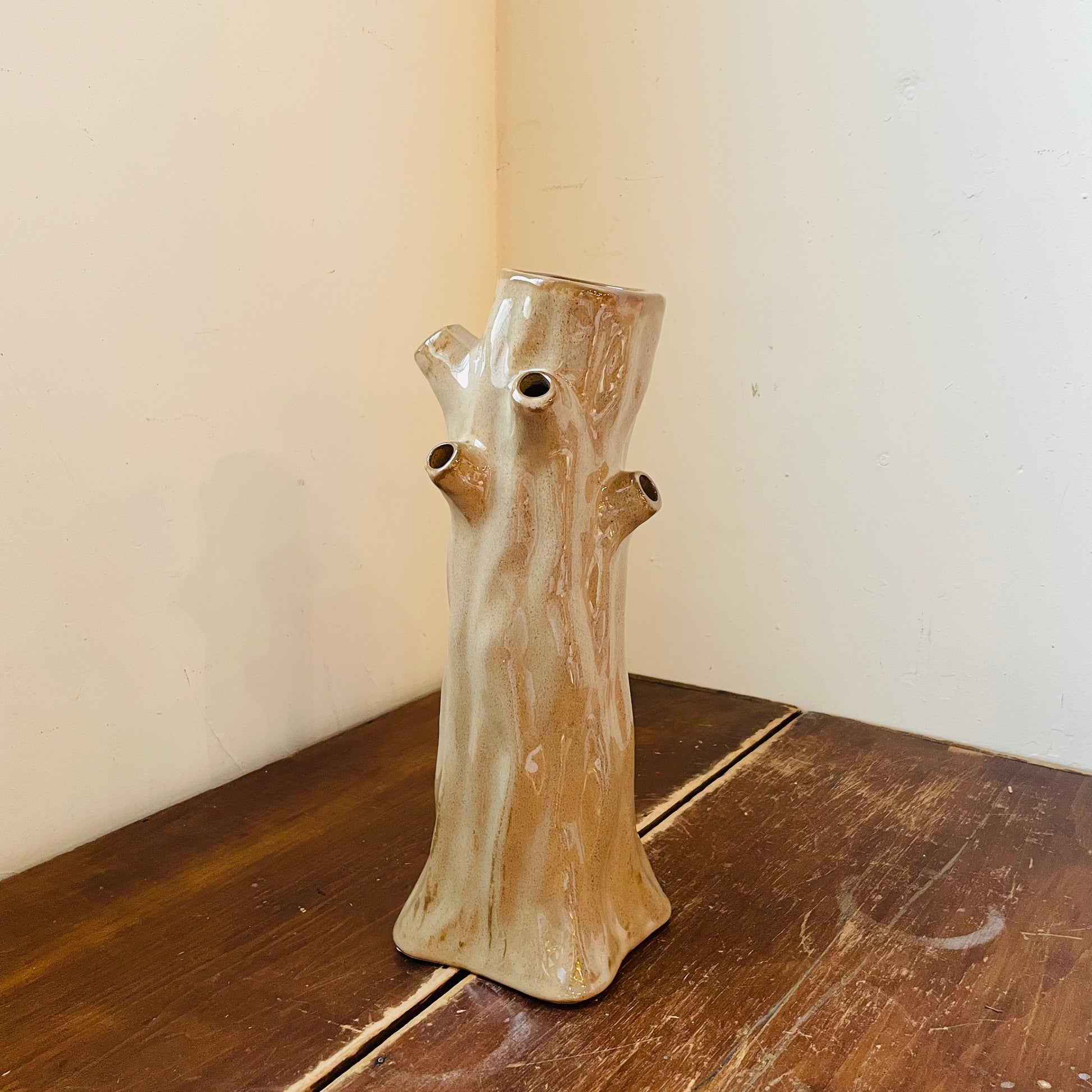 The Feltro Faux De Bois Tulipere is a ceramic vase shaped like a tree trunk in sandy brown. Branch-like openings serve as hollow stems for displaying fresh or faux flowers. Available in tall and short sizes, it functions as standalone décor or as a vessel for floral arrangements. Perfect for adding natural character to shelves, tables, and entryways.