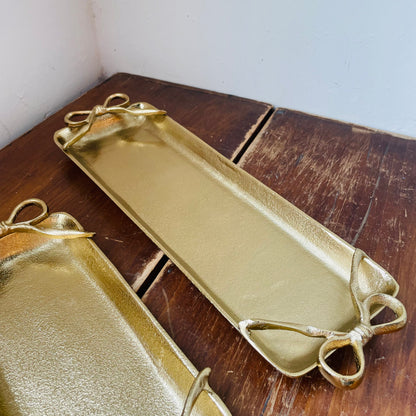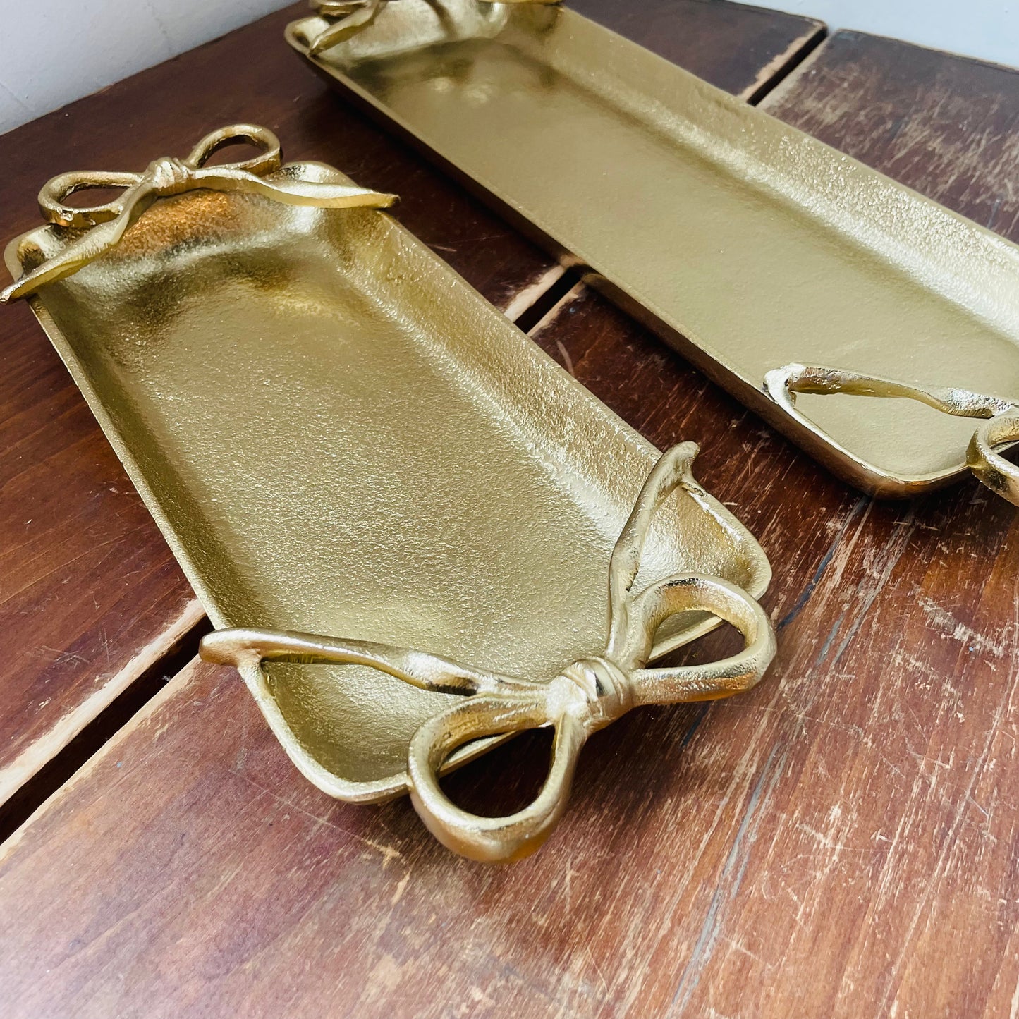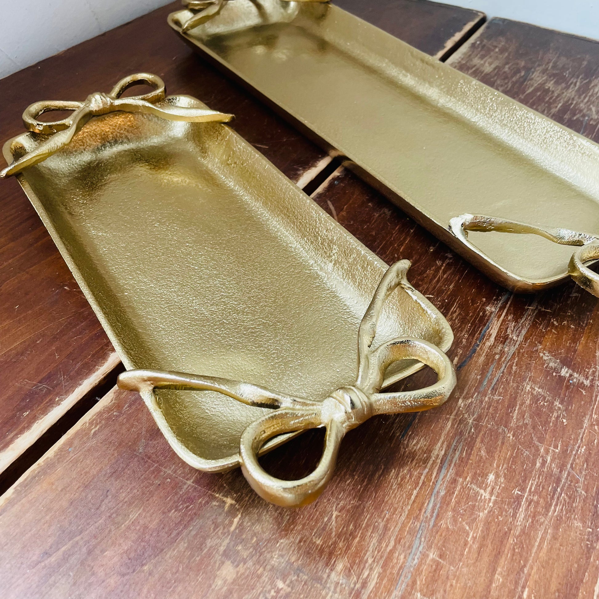 This set of two gold-handled trays features elegant bow details and comes in two sizes, offering versatility for various serving needs. Made from durable aluminum, these trays are perfect for food presentation or as stylish accents on your table. They are food safe and add a touch of luxury to any occasion.