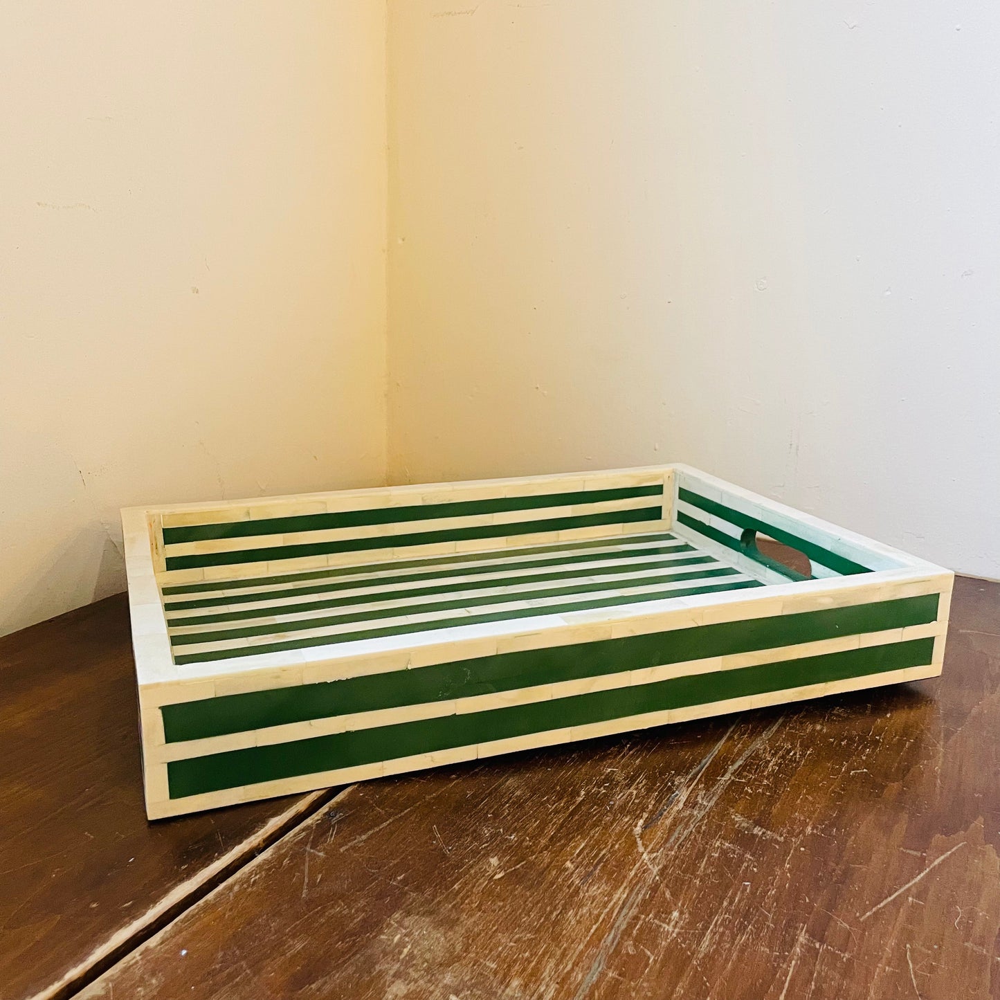 18"L x 12"W x 2-1/2"H Decorative Bone & Resin Inlaid Tray w/ Handles, Green & Cream Color