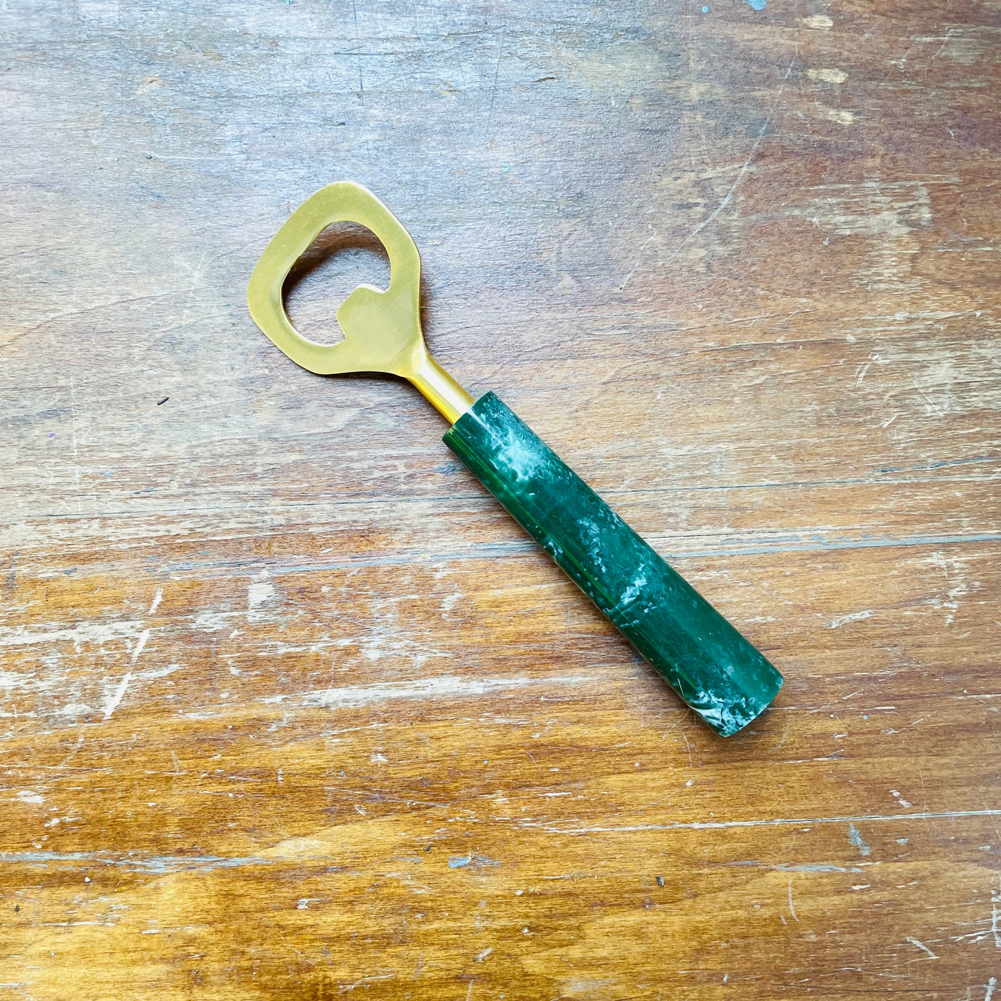 5-3/4"L Stainless Steel & Resin Bottle Opener, Gold Finish, Marbled Green (Each One Will Vary)