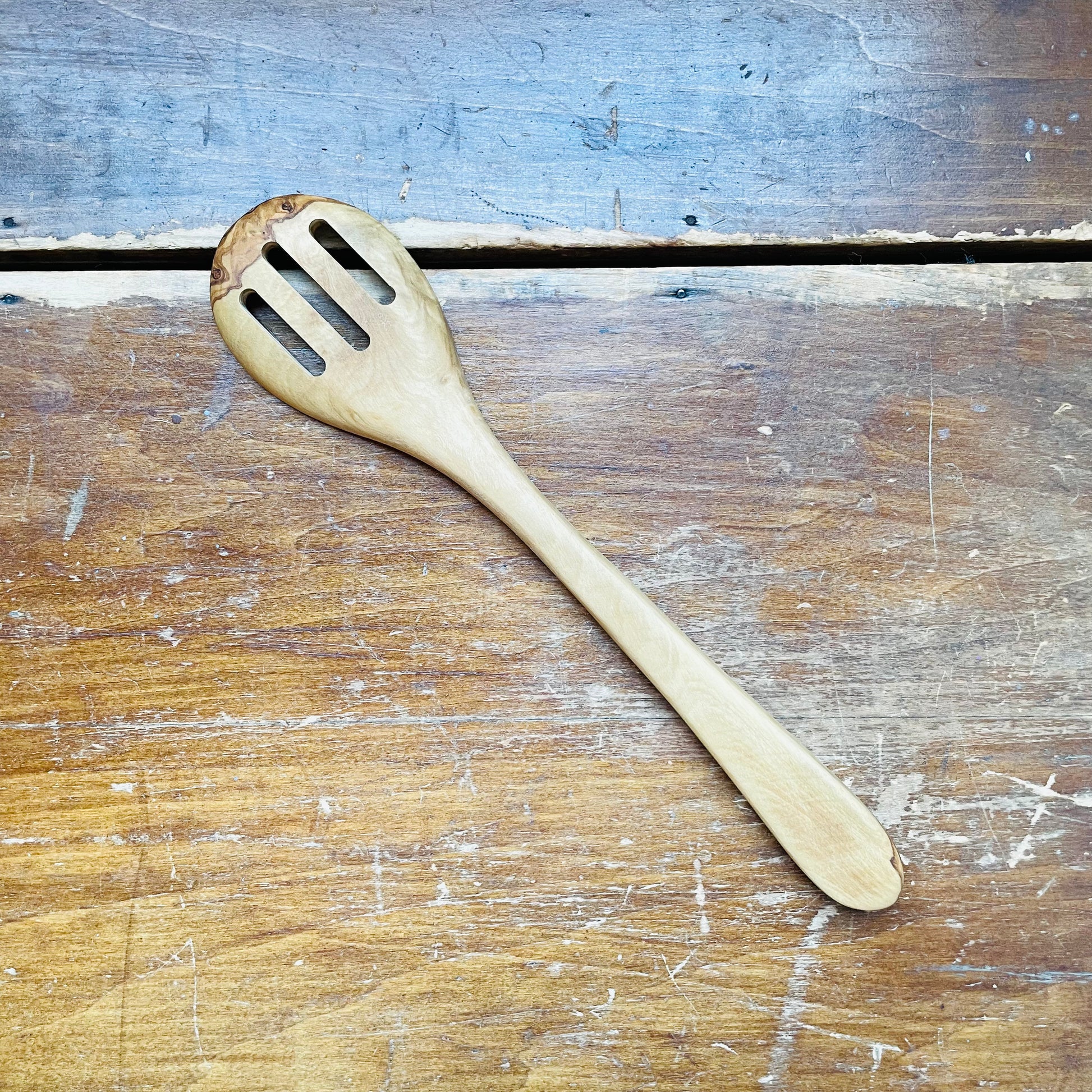A handmade olive wood slotted spoon for serving. It features a long handle and a spoon head with slots, allowing liquids to drain while scooping and serving solid foods. The olive wood provides a durable material with a unique grain pattern on each spoon, giving it a distinctive, natural look. The handle is smoothed for a comfortable grip, and there's a hole at the end for convenient hanging storage. This slotted spoon is practical for serving a variety of dishes and adds a touch of rustic charm to the table or kitchen.