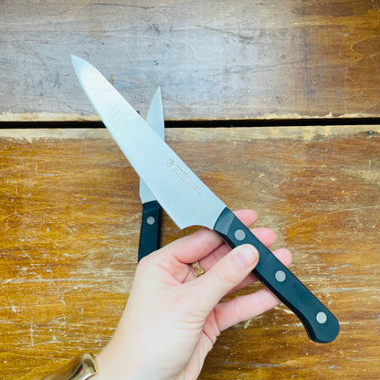Equip your kitchen for less with these essential knives. The 2-piece prep set features two workhorses in the kitchen: the prep knife and the paring knife. The compact all-rounder prep knife is for precision cutting jobs in-hand or on a cutting board, while the paring knife is ideal for smaller scale jobs like peeling vegetables and segmenting fruit. Honed for long-lasting sharpness, these fine-edge blades make fast work of kitchen prep. Since 1895, Henckels has been making high quality knives at an exceptional value. Solution knives are designed to tackle every kitchen task. Fabricated from high-quality stainless steel, the single-piece, precision-stamped knife blades are lightweight without sacrificing strength and durability. Curved for comfort, the break-proof, triple-rivet handles are pleasant to grip, giving you the control you need to slice through tougher cuts with ease. This ergonomic handle lets you enjoy maximum maneuverability and fatigue-free cutting.