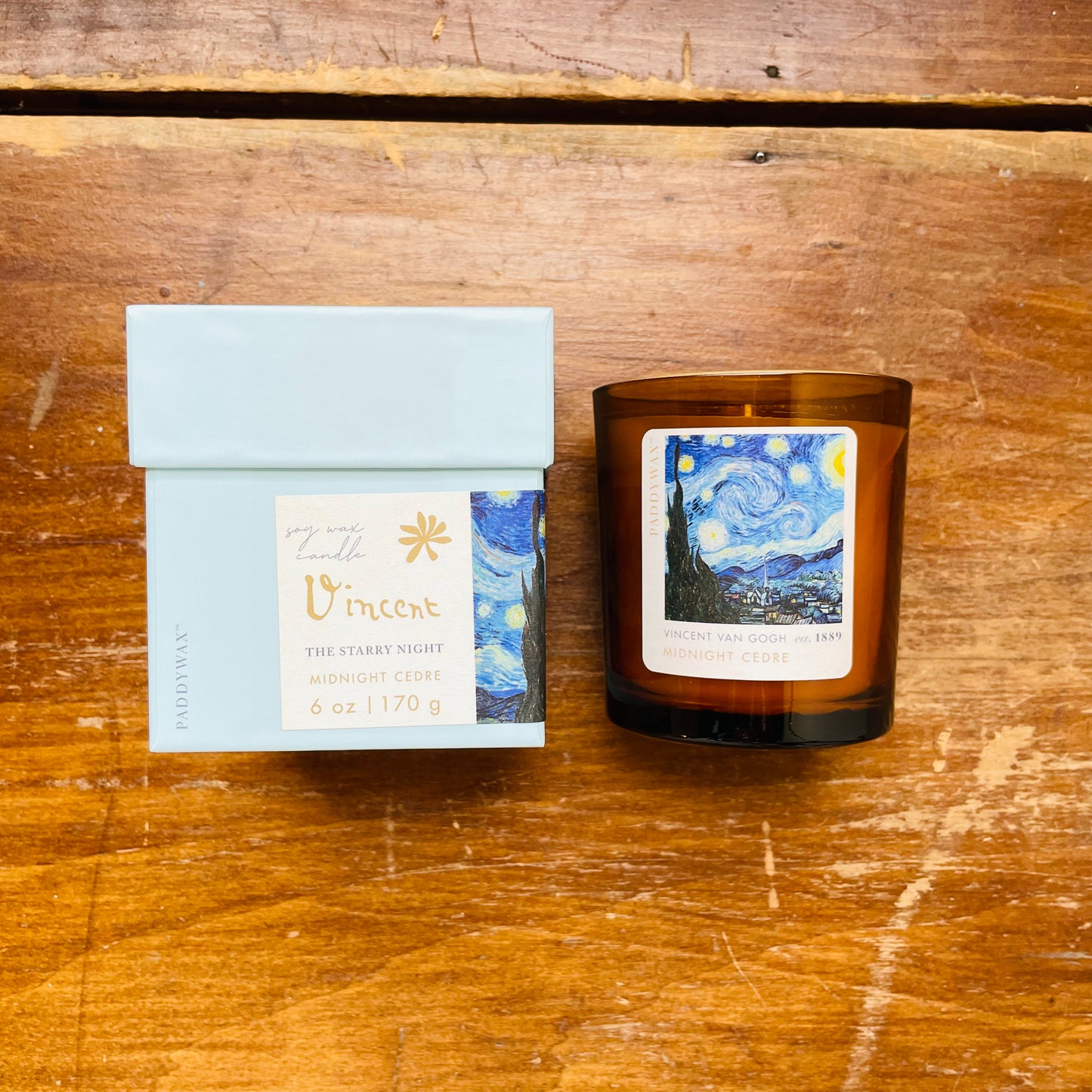 Vincent Van Gogh's "The Starry Night" inspires this soy wax candle with the scent of Midnight Cedre.