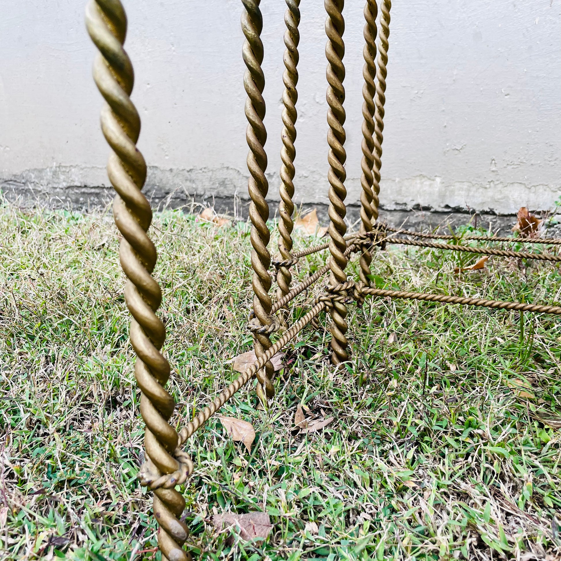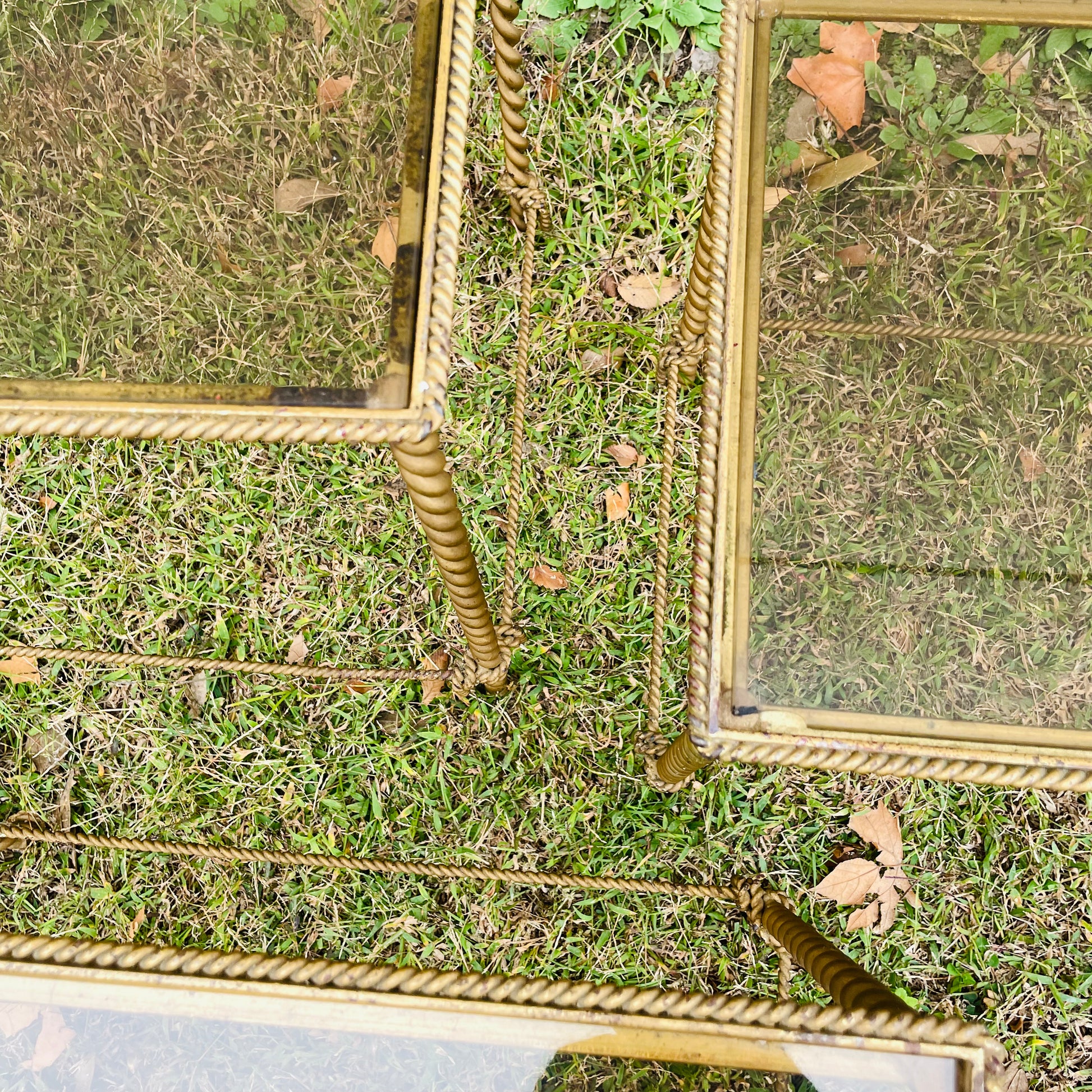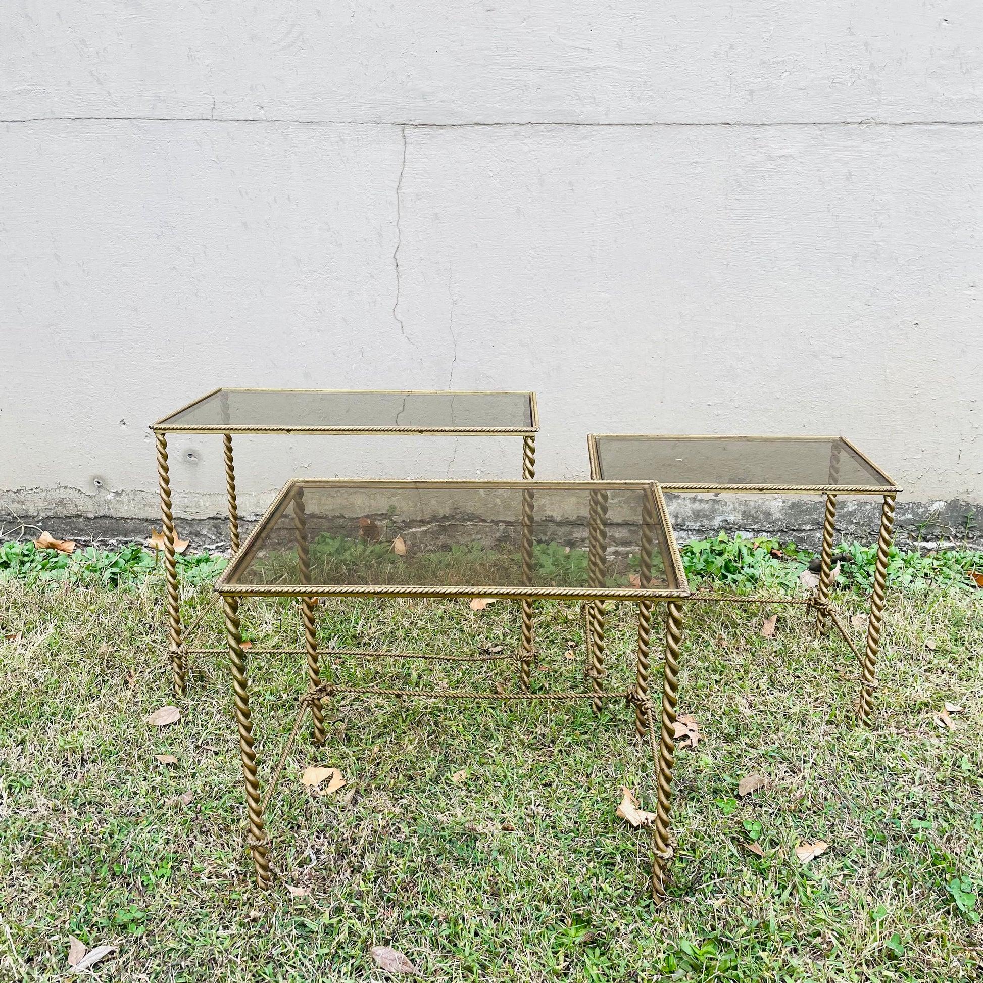 Glass top with twisted rope legs. Set of 3 nesting tables