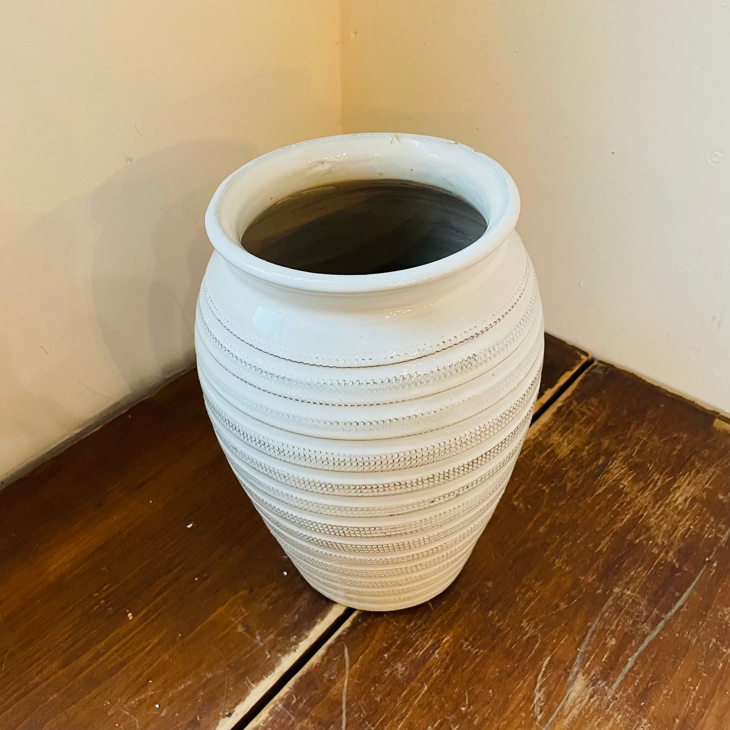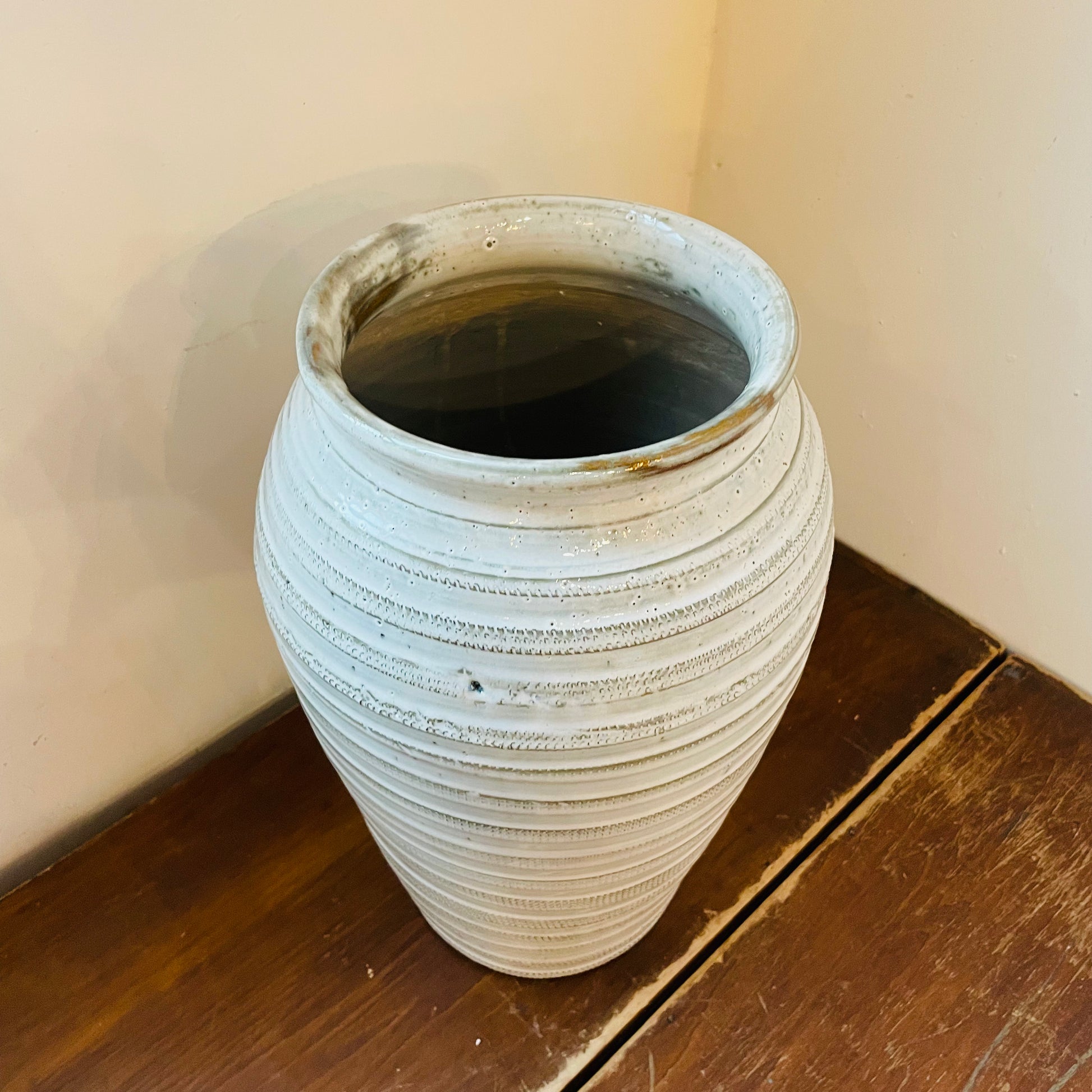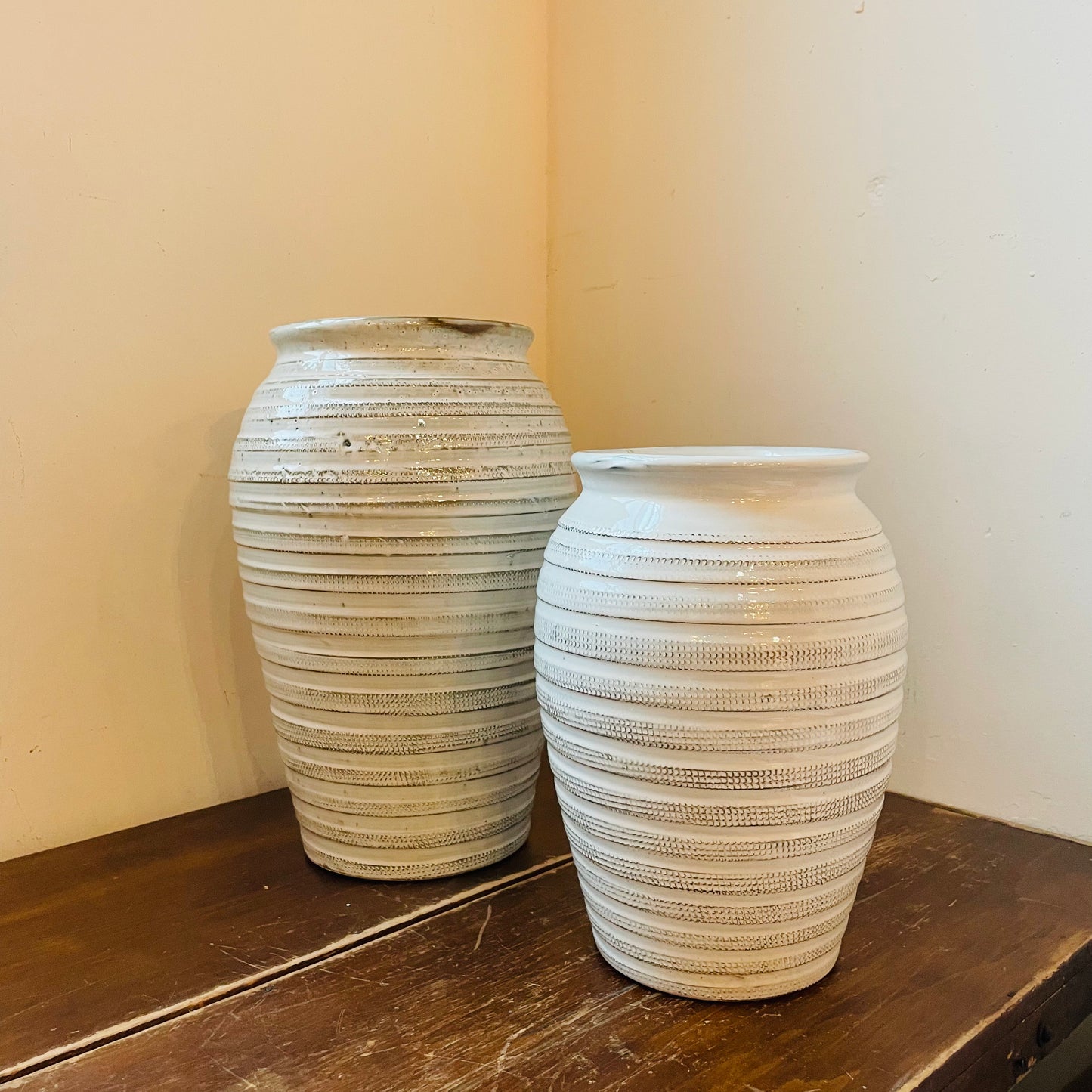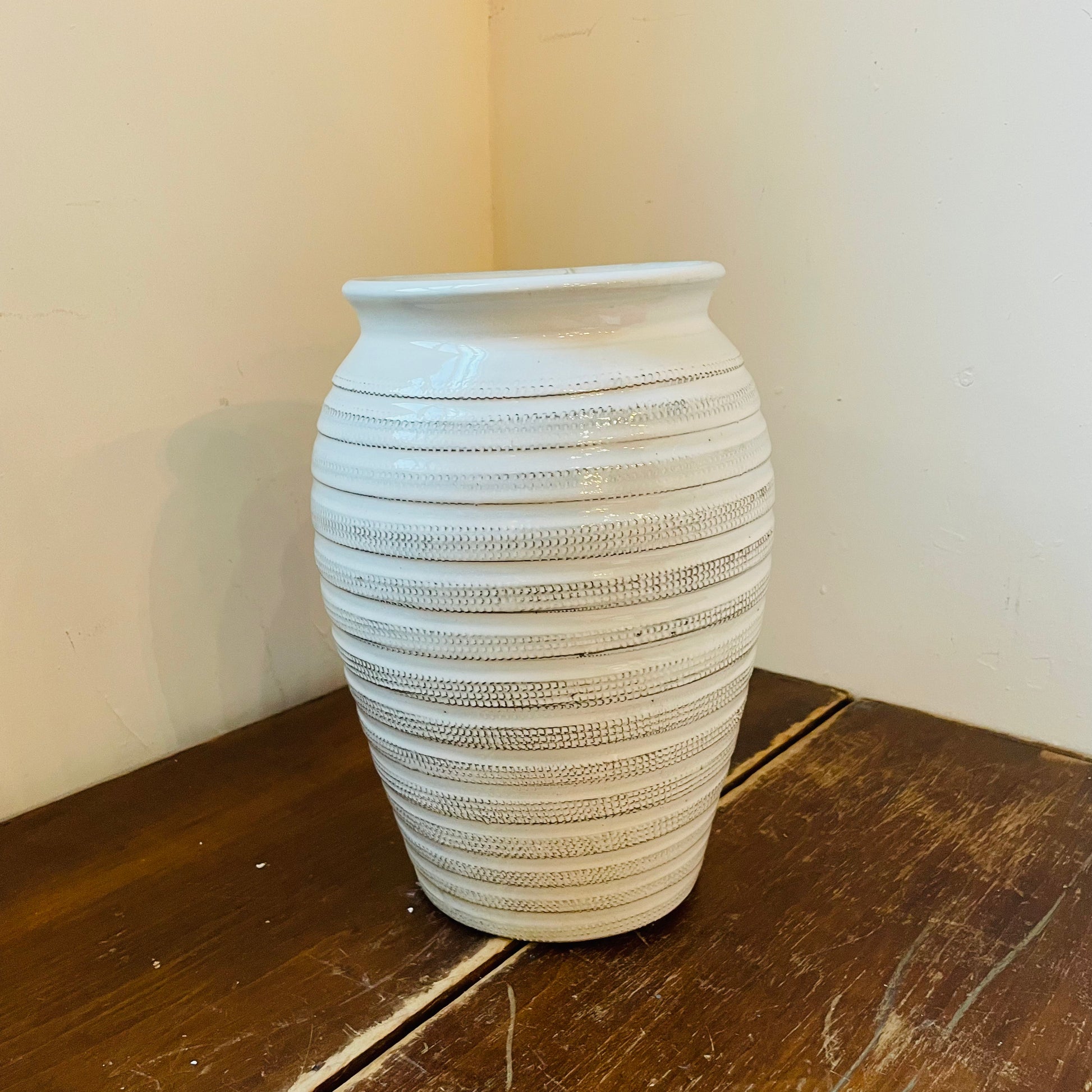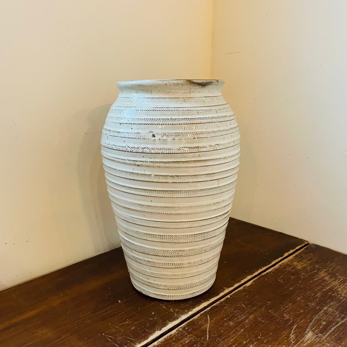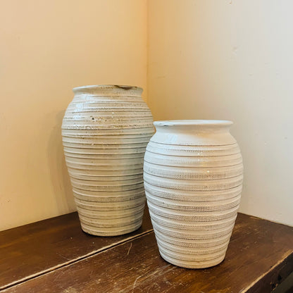 Standing at 15 inches tall with an 9.5 inch diameter, this round table vase features a stunning blend of beige and white hues. The horizontal ridges around the vase not only add visual interest and dimension, but also create a sense of luxury. Its simple yet sophisticated look complements a wide range of decor styles, making it a versatile choice for any room. Elevate your living space with the timeless elegance of the Jaxton Tall Vase.