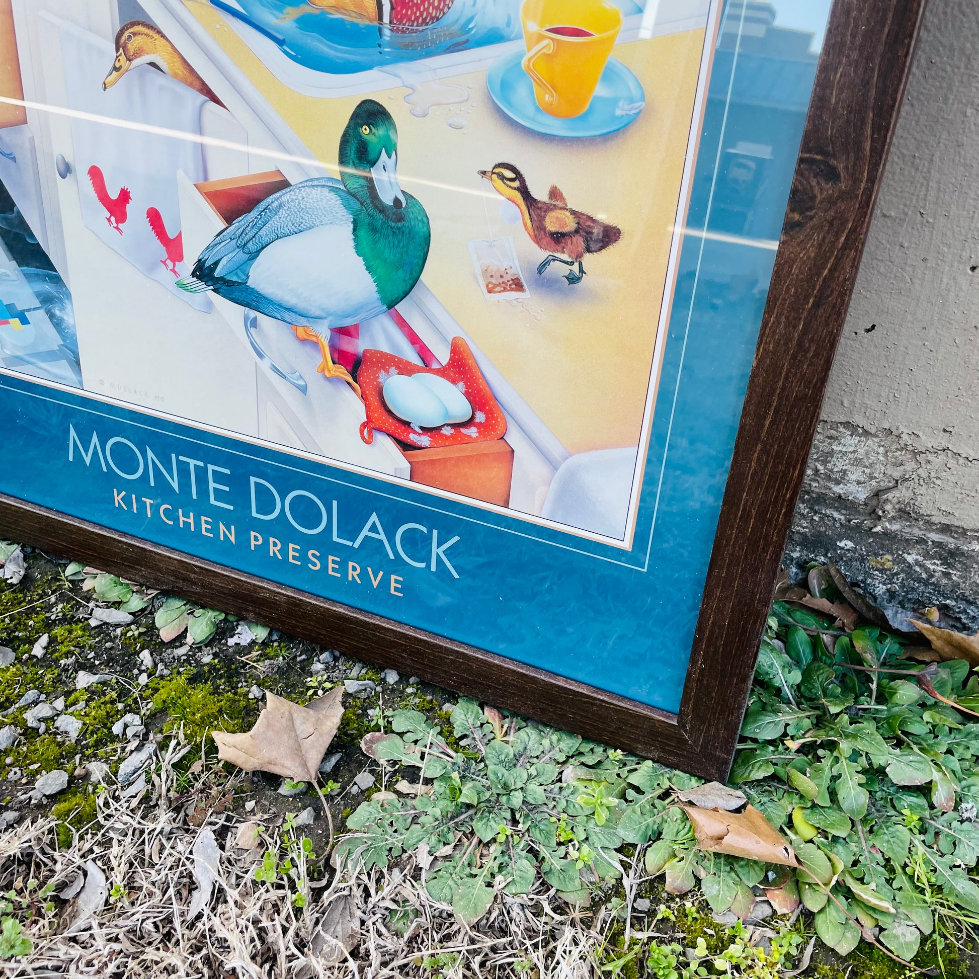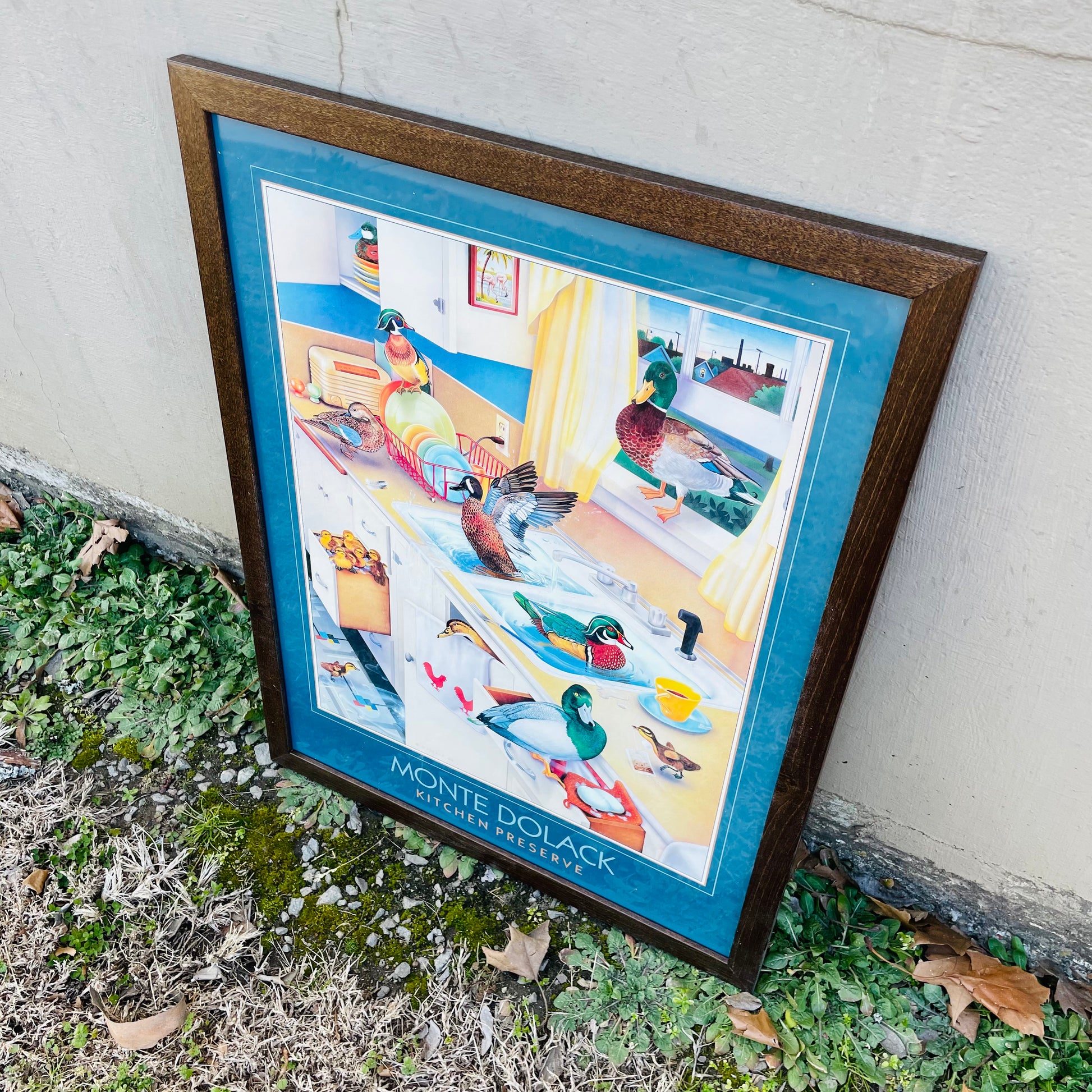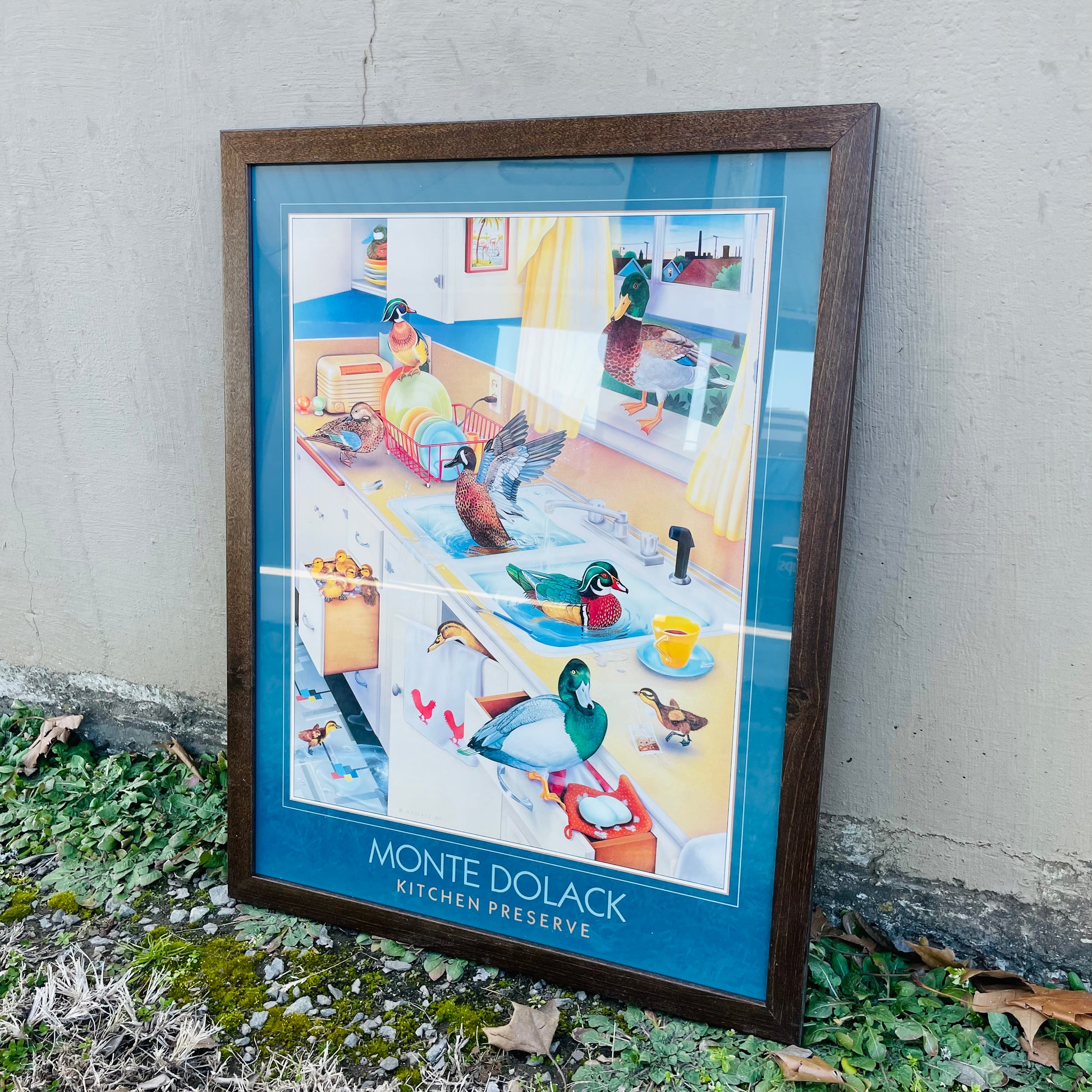 This piece is one of the "Invader Series." In it, Monte uses intellectual wit and style to discuss the conflict between humans and nature. The ducks splash around in an art deco kitchen playing as they would in a pond.