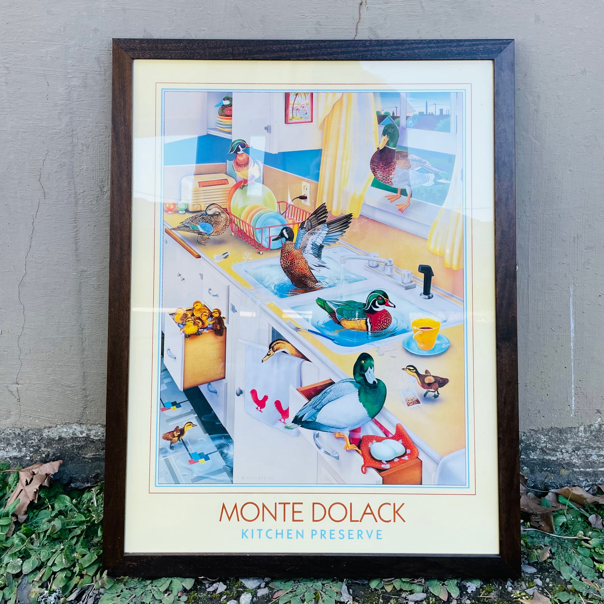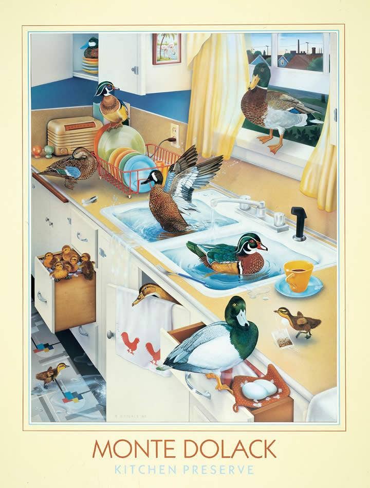 This piece is one of the "Invader Series." In it, Monte uses intellectual wit and style to discuss the conflict between humans and nature. The ducks splash around in an art deco kitchen playing as they would in a pond.