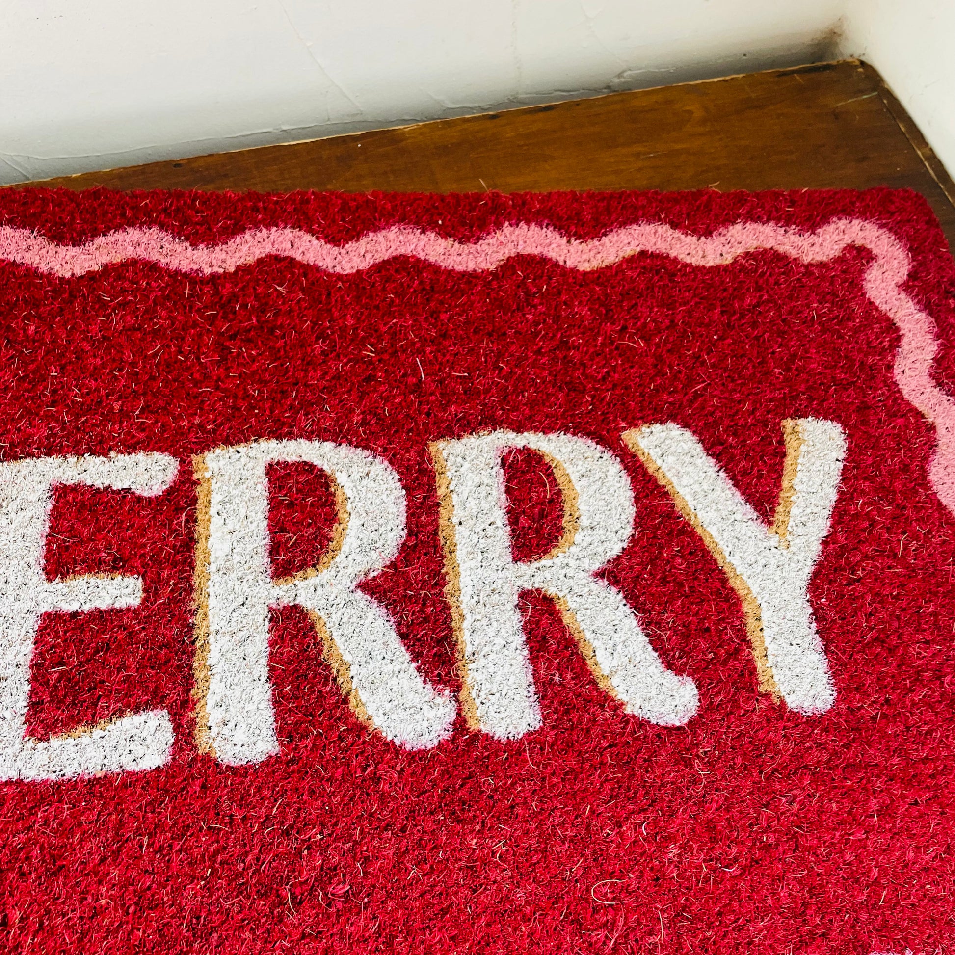 Make spirits bright right from the doorstep with the “M-E-R-R-Y” Doormat! This festive mat features bold ivory lettering on a cheerful red background, framed by a playful pink squiggle border that adds a pop of personality. Made from durable coir fiber, it’s designed to keep shoes clean and bring a little holiday magic to your entryway. Whether you're welcoming guests or just dashing through the door, this mat sets the tone for a joyful season.