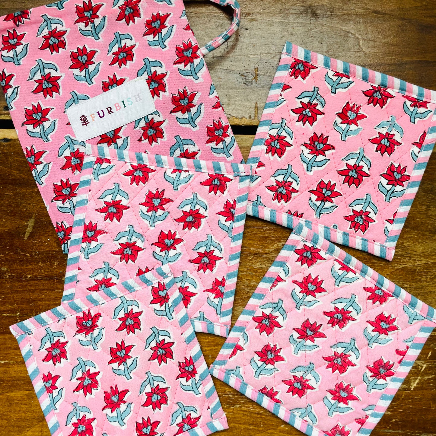 Cocktail hour gets extra festive with our exclusive blockprint quilted coasters. Handmade in India, the charming color combo and chic striped trim make a bold statement. Add to your own bar cart or they make an excellent gift.