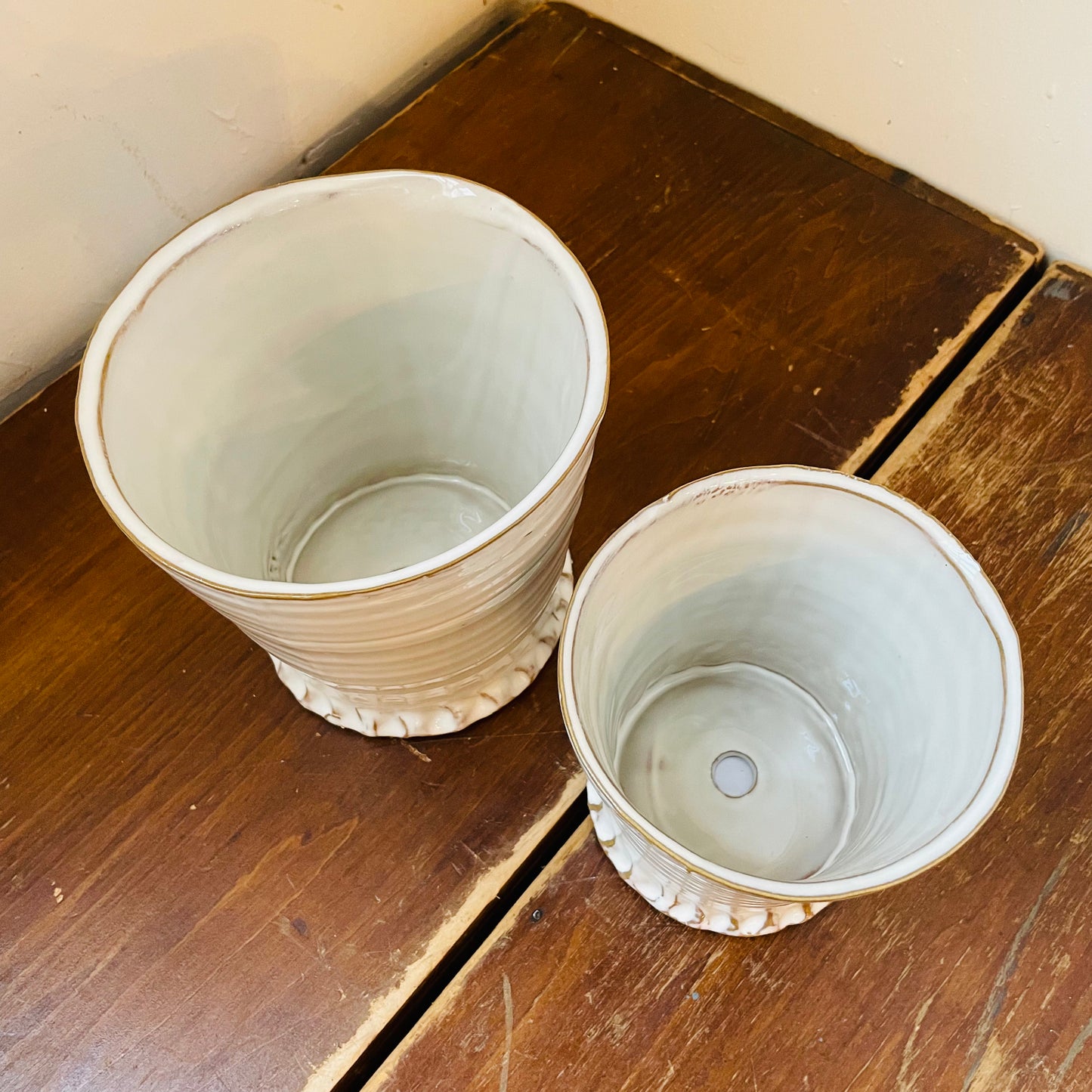 Ceramic pots with drainage holes.