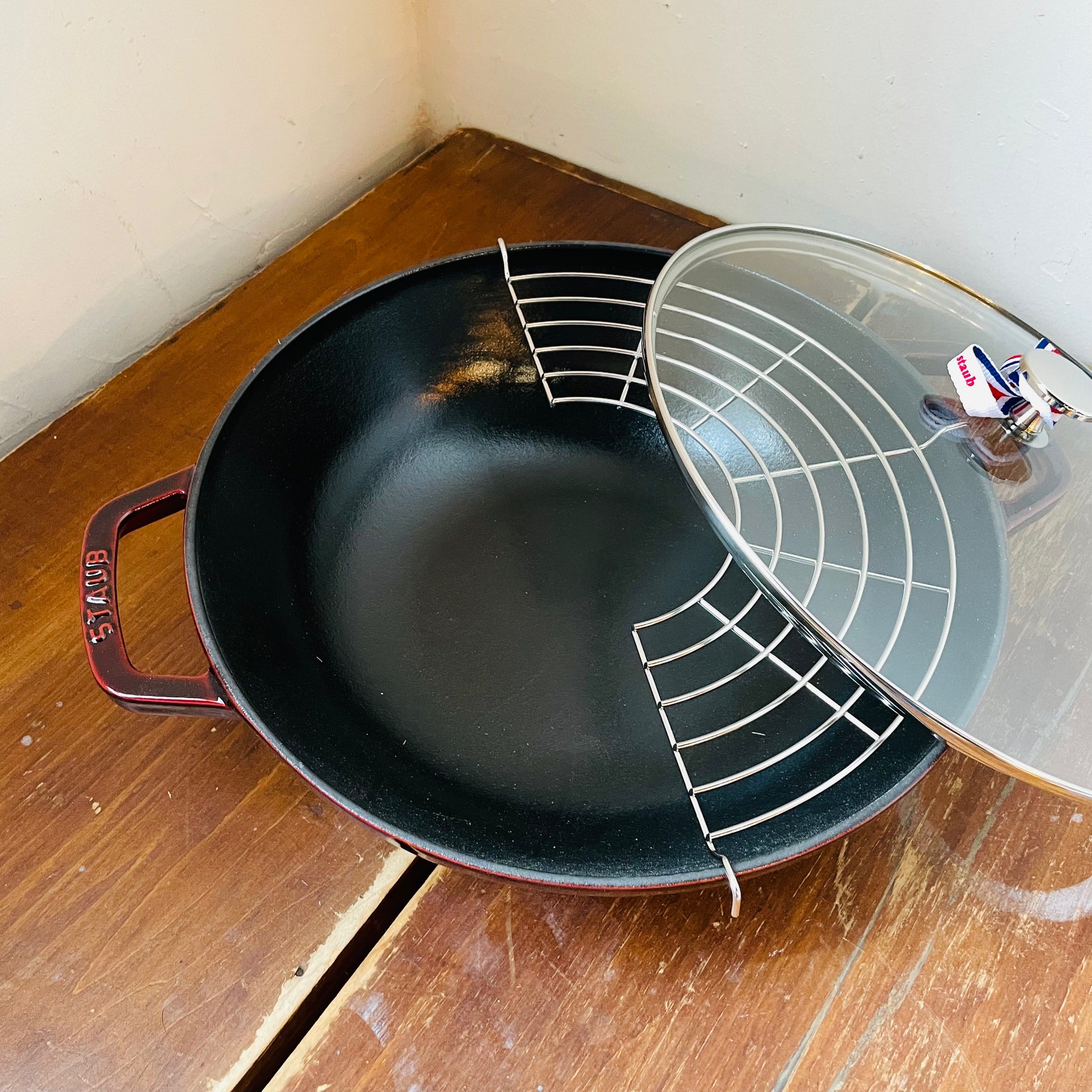 The STAUB Perfect Pan is a sturdy cast iron wok for quick-cooking dinners like stir fries, and other one pot meals. Not just for stir-fries, this pan is designed for searing, sautéing, browning, steaming, and deep frying as well. Wide, angled sides facilitate stirring without spilling and help to reduce grease splatter on the stovetop. Thanks to its cast iron construction, the pan retains heat remarkably well, ensuring even cooking throughout.