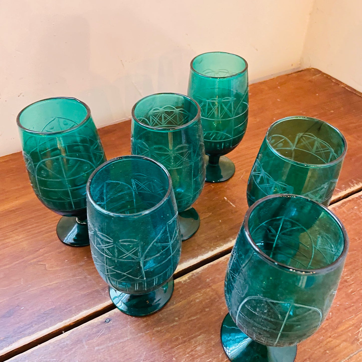 Teal Hand-Blown Etched Glasses- Set of 6