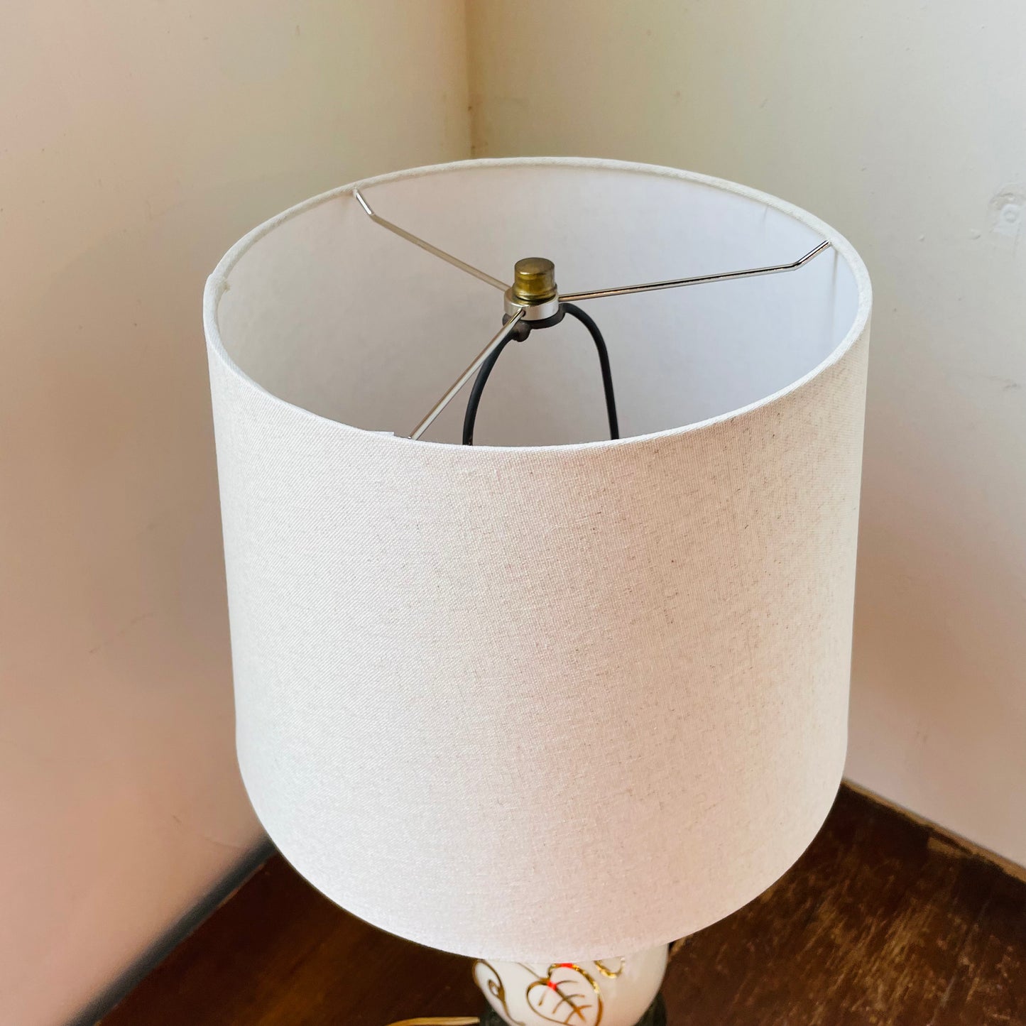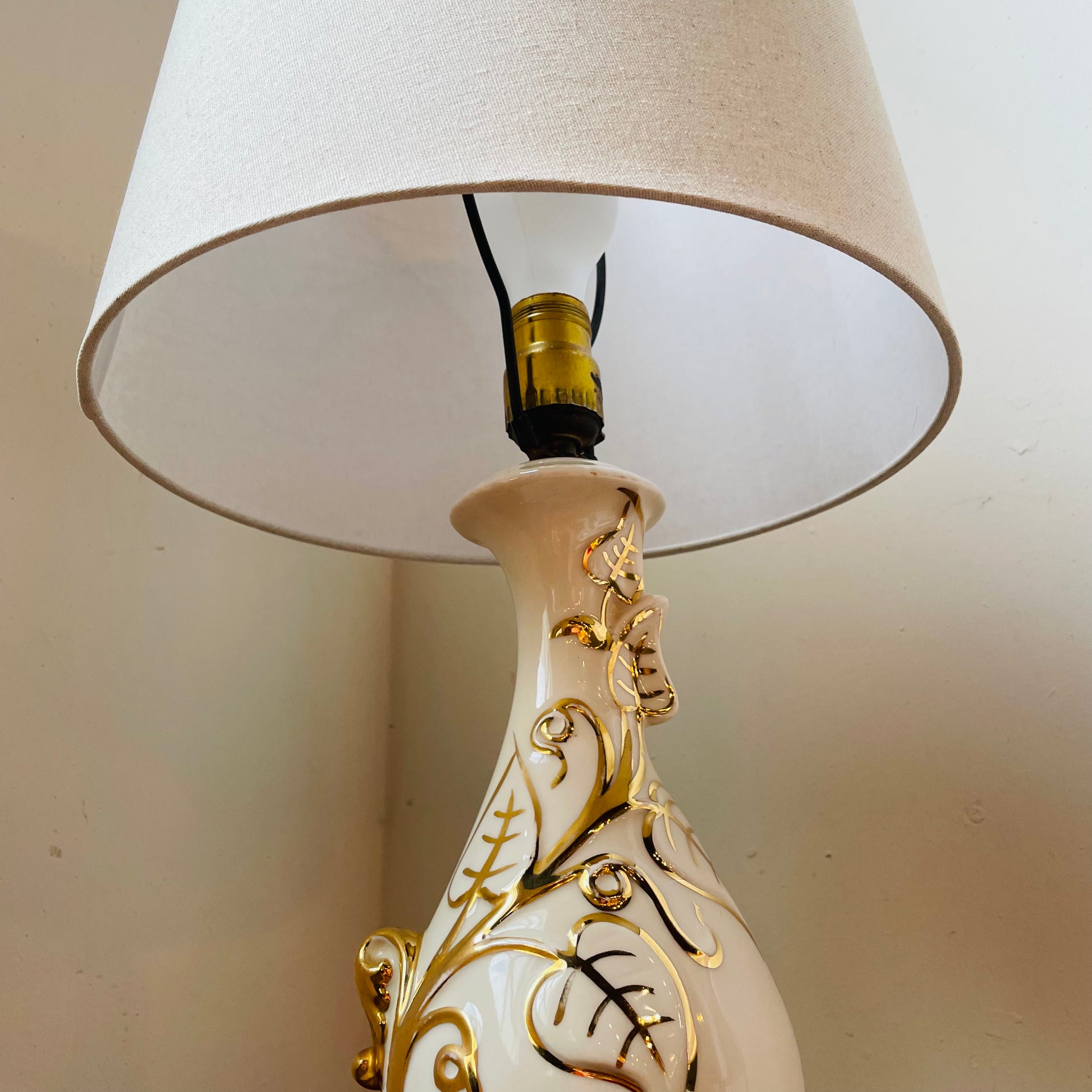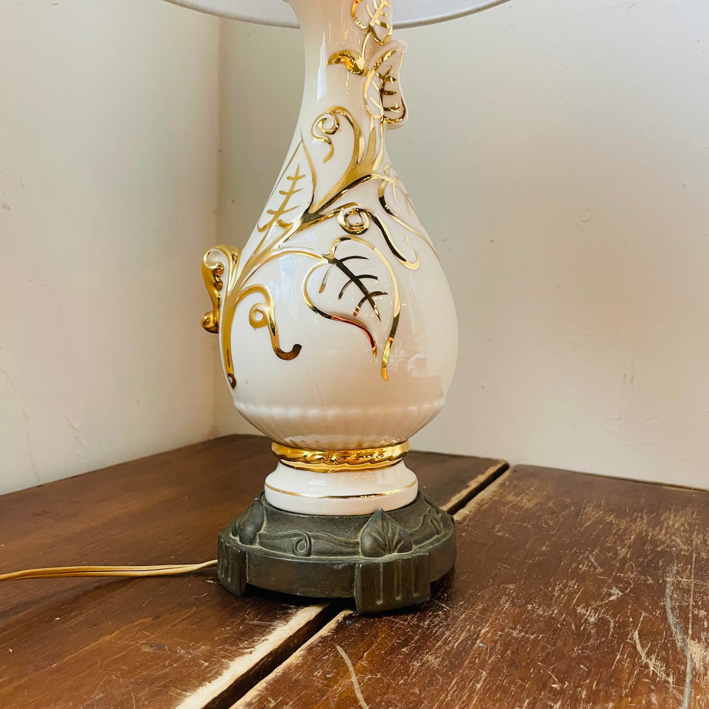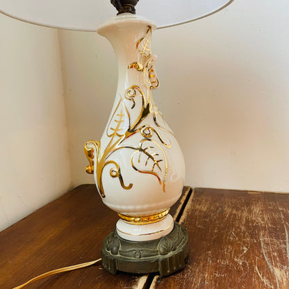 White ceramic base with gold leaf detail & an ornate metal base, working lamp.