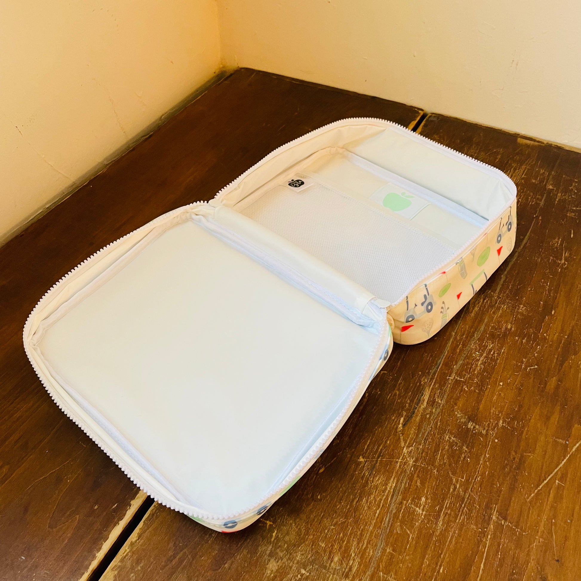 Coated, clean, and cute! The Lunchbox available several classic patterns, all wipeable. It is just the right size for your bento box. Equipped with a mesh inner pocket to hold your cooler packs and love notes, specifically placed on the back of the lunchbox leaving the front open for monogramming.
