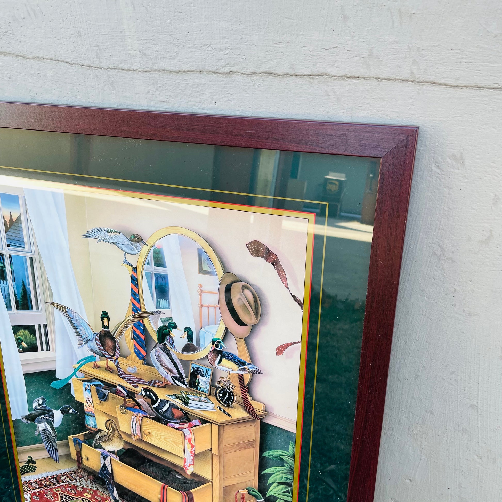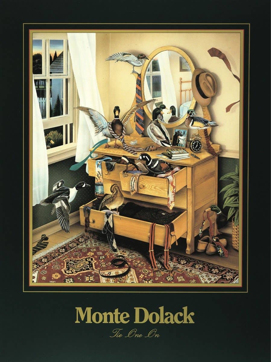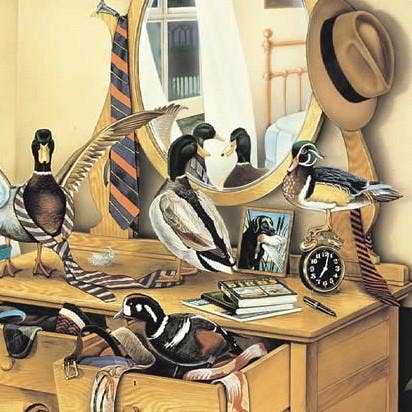 In this poster from the Invader Series, a group of ducks takes over a chest of drawers and wreaks havoc trying on various ties and suspenders.