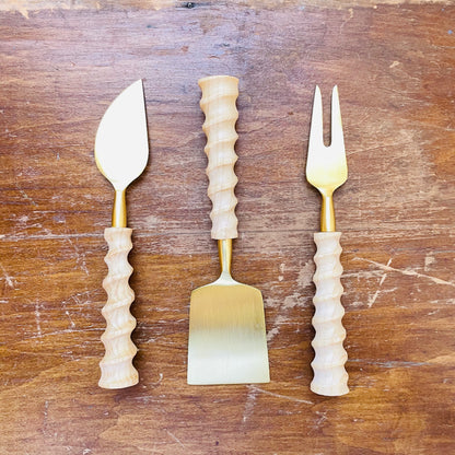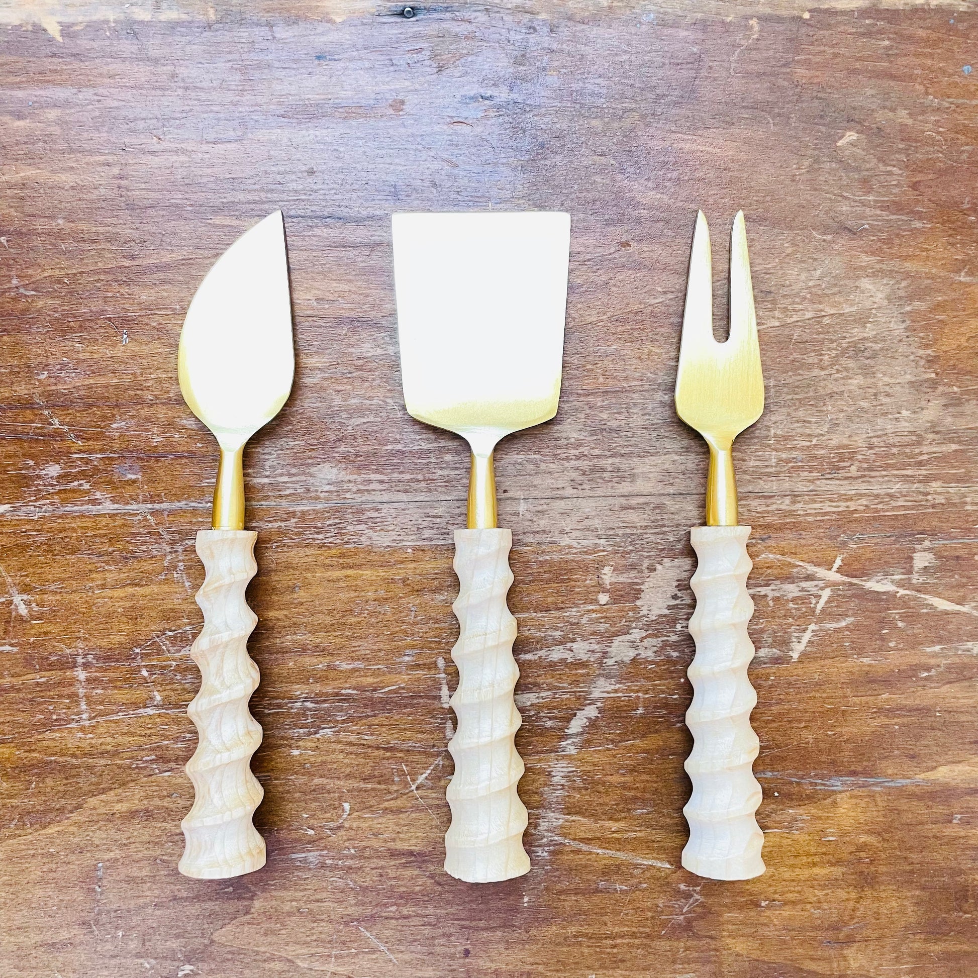 6-3/4"L Stainless Steel Cheese Knives w/ Carved Teakwood Handles, Gold Finish & Natural, Set of 3