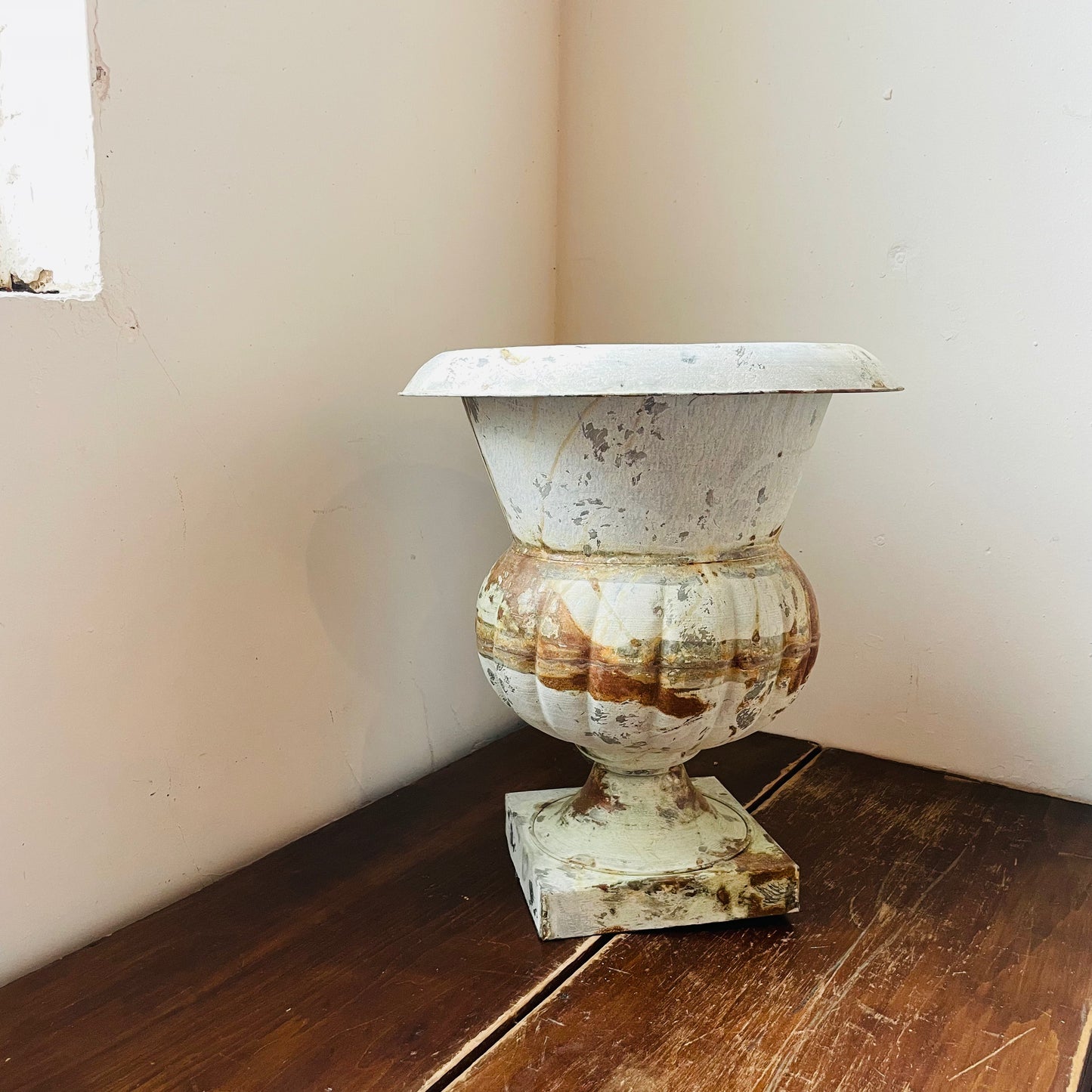 This artisan crafted container features the rustic beauty of seams and welds of the craftsman with the beautiful form of a classic urn.
